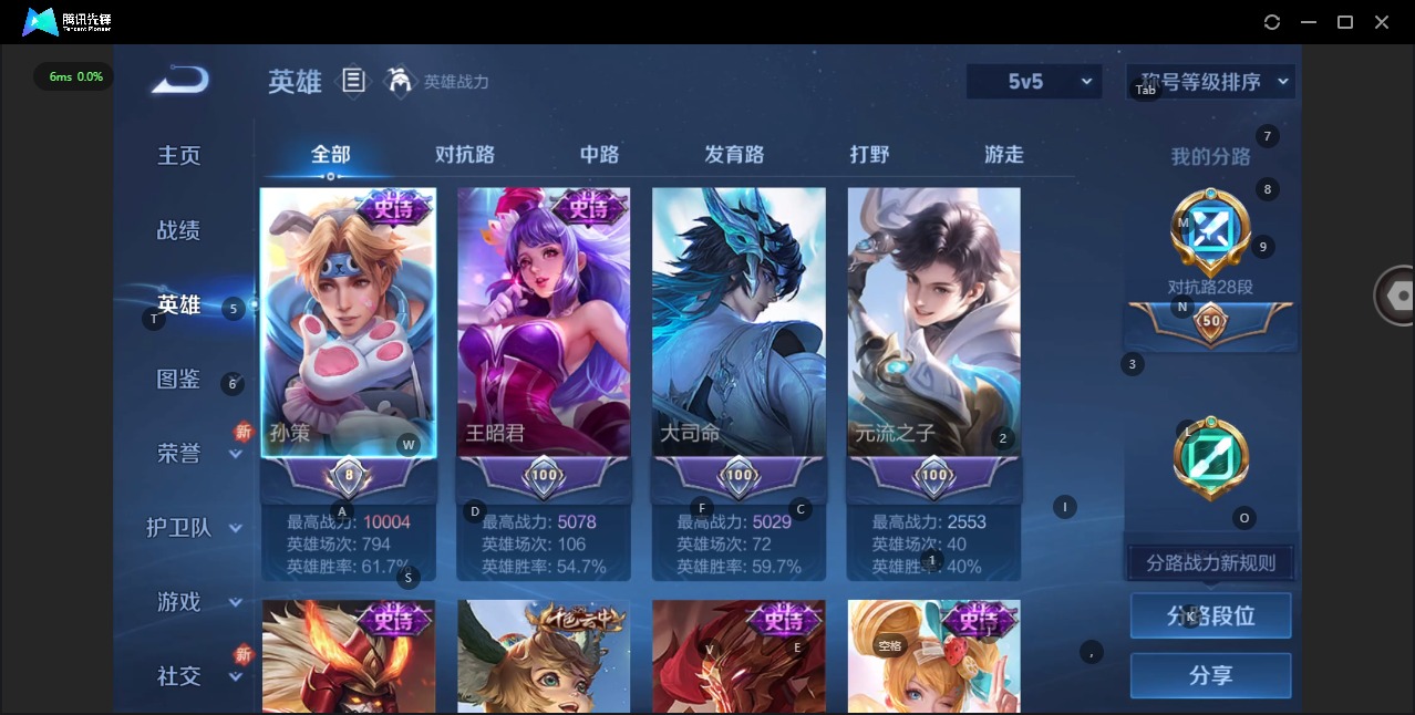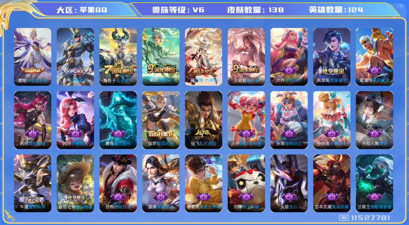 [11527781]V6 1典藏 3传说 124英雄 138皮肤 可修改实名 优质装备:神鉴启示录 珍宝阁皮:玩趣恶龙 限定皮:愿照·九州拓(澜年限),逐霄战戟,映山客,鸣野蒿,五谷丰年 史诗皮:星界战将,破空之剑,蔬乡物语(鲁班七号),紫霞仙子,黄金分割率,特工魅影,魅语,高渐离燃音魔法,偶像歌手,暗夜猫娘,龙骑士(小龙虾),猫狗日记-孙策,猫狗日记-大乔,乱世虎臣,节奏热浪,摇滚巨星,水果甜心,绅士熊喵,功夫厨神,暗隐猎兽者,幽灵船长,鬼剑武藏,心灵战警,缤纷独角兽,乘风破浪,逐浪之夏,水晶猎龙者,箭羽风息,金属风暴,原初追逐者,圣诞狂欢,圣诞恋歌,鹰眼统帅,无心,未来纪元-赵云