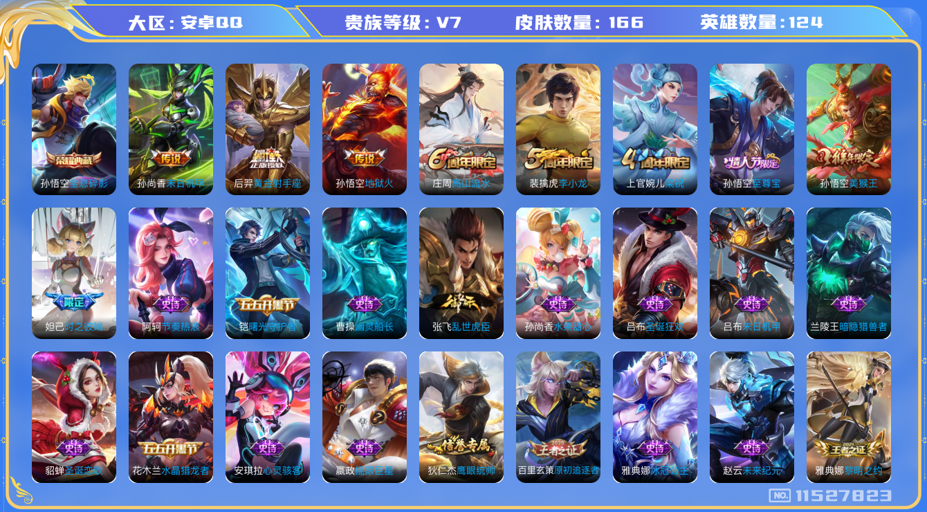 [11527823]V7 1典藏 3传说 124英雄 166皮肤 可修改实名 优质装备:全息碎影(猴子典藏),黄金射手座,末日机甲-孙尚香(绿蚂蚱),地狱火 珍宝阁皮:玩趣恶龙 限定皮:至尊宝,时之彼端,高山流水,梁祝,李小龙,美猴王 史诗皮:冰冠公主,偶像歌手,龙骑士(小龙虾),末日机甲-吕布,乱世虎臣,节奏热浪,修罗,摇滚巨星,水果甜心,心灵骇客,暗隐猎兽者,幽灵船长,水晶猎龙者,曙光守护者,金属风暴,原初追逐者,圣诞狂欢,圣诞恋歌,鹰眼统帅,魅力维加斯,黎明之约,未来纪元-赵云