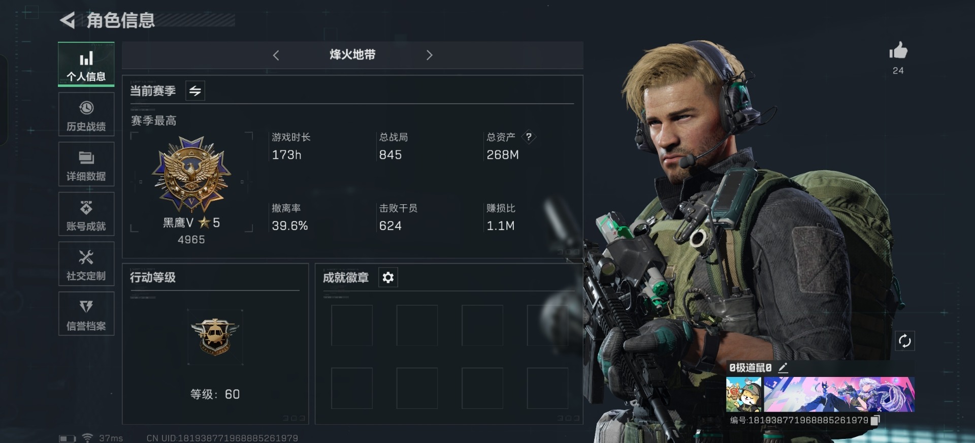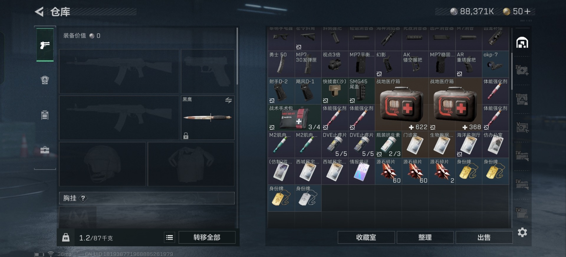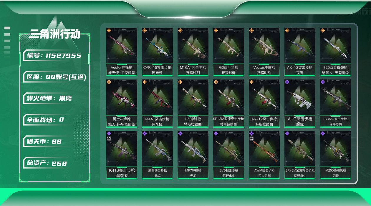 [11527955]总资产:268M 1干员外观 12传说枪械 哈夫币:88.371K 可二次 可修改实名 优质装备:顶级安全箱(3x3) 烽火地带段位:黑鹰 全面战场段位:校官 传说武器皮肤:AK-12突击步枪-夜鹰,Vector冲锋枪-狩猎时刻,G3战斗步枪-狩猎时刻,M16A4突击步枪-狩猎时刻,AK-12突击步枪-特斯拉线圈,CAR-15突击步枪-阿米娅,SR-3M紧凑突击步枪-特斯拉线圈,UZI冲锋枪-特斯拉线圈,勇士冲锋枪-能天使-午夜邮差,Vector冲锋枪-能天使-午夜邮差,M4A1突击步枪-阿米娅,725双管霰弹枪-送葬人-无题密令 史诗武器皮肤:K416突击步枪-潜袭者,AWM狙击步枪-私人定制(典藏),AUG突击步枪-蝮蛇,Ash-12战斗步枪-守夜人,PKM通用机枪-守夜人,AS Val突击步枪-尖端治疗,M700狙击步枪-守夜人,SG552突击步枪-尖端治疗,SR-25射手步枪-尖端治疗,PKM通用机枪-荒野求生,MP5冲锋枪-深海恐惧,SG552突击步枪-深海恐惧,AKM突击步枪-林中猎手,SR-3M紧凑突击步枪-荒野求生,M1014霰弹枪-林中猎手,PTR-32突击步枪-英雄,SVD狙击步枪-荒野求生,M250通用机枪-囚徒,SV-98狙击步枪-囚徒,腾龙突击步枪-无垢,MP7冲锋枪-无垢,PSG-1射手步枪-无垢 干员外观:露娜-黑·天际线