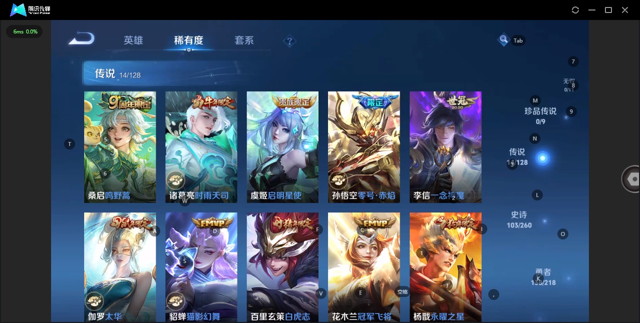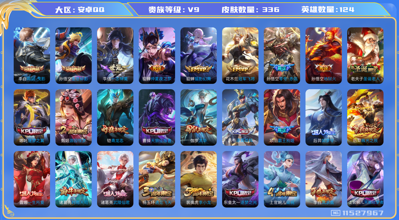 - [11252252]V8 4典藏 11传说 125英雄 268皮肤 可修改实名 荣耀水晶:神鉴启示录,全息碎影(猴子典藏),无限飓风号(高达),星空梦想(太空人) 传说皮:幻光神枪,李逍遥,山海·炽霜斩(李信年限),黄金射手座,地狱火,地狱之眼,胖达荣荣,超时空战士-狄仁杰 珍宝阁皮:优雅恋人,玩趣恶龙 限定皮:愿照·九州拓(澜年限),逐霄战戟,至尊宝,神威(电光马子),飞衡(韩信年限),高山流水,齐天大圣,降魔,五谷丰年,冰锋战神,游园惊梦,御风骁将(吕布年限),逐梦之星,天狼溯光者,李小龙,逐梦之影,孙行者,乒乒小将,蜜橘之夏,美猴王 史诗皮:茶境仙,器灵·浮梦炉,龙之律动,化蝶舞,紫霞仙子,苍穹之光,电玩小子(小书包),白龙吟,特工魅影,千年之狐,冰冠公主,偶像歌手,晚萤,魅语,暗夜猫娘,龙骑士(小龙虾),时之恋人-孙尚香,乱世虎臣,节奏热浪,修罗,女仆咖啡,水果甜心,天才门将,心灵骇客,功夫厨神,暗隐猎兽者,幽灵船长,鬼剑武藏,暗渊魔法,心灵战警,地狱岩魂,诗语江南,拒霜思,缤纷独角兽,乘风破浪,逐浪之夏,曙光守护者,热力回旋,箭羽风息,唤灵魅影,金属风暴,圣诞狂欢,圣诞恋歌,鹰眼统帅,暗夜贵公子,魅力维加斯,未来纪元-赵云
