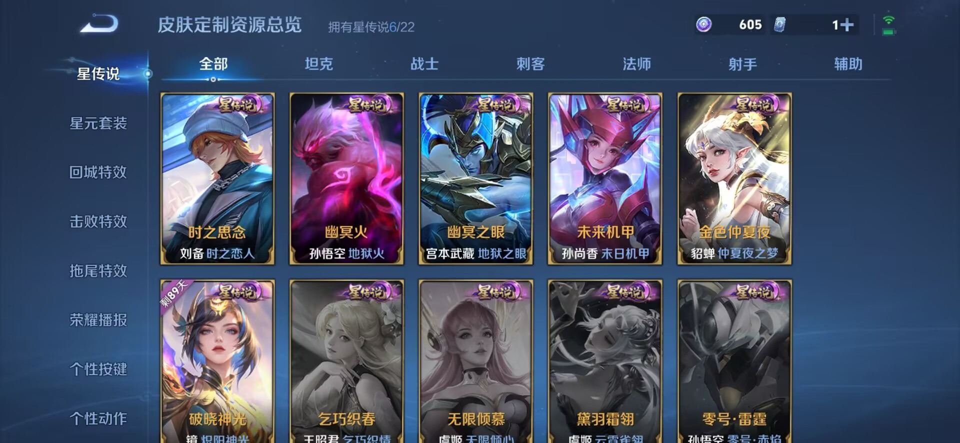 铠青龙志,伽罗天狼溯光者,伽罗太华,孙膑天狼运算者,干将莫邪冰霜恋舞曲,典韦岱宗,孙尚香异界灵契,牛魔奔雷神使,吕布御风骁将,后羿如梦令,诸葛亮时雨天司,公孙离祈雪灵祝,公孙离蜜橘之夏,司空震愿照·山河定,裴擒虎李小龙,上官婉儿梁祝,上官婉儿神器·万象笔,上官婉儿天狼绘梦者,李白诗剑行,花木兰默契交锋,安琪拉魔法小厨娘,马可波罗山海·玄木吟,桑启鸣野蒿,女娲愿照·千秋盛,孙悟空孙行者,孙悟空大圣娶亲,芈月白晶晶,孙悟空至尊宝,百里玄策白虎志,马超神威,妲己时之奇旅,虞姬愿照·岁时盈,关羽武圣,橘右京枫霜尽