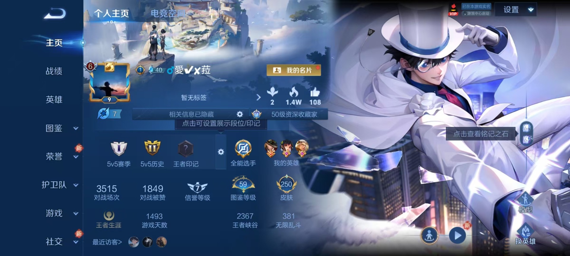 - PX_2107768-实名: 不可修改 性别: 男号 贵族等级: V9 英雄数: 126 皮肤数: 458 荣耀水晶: 武则天,杀手不太冷,幻阙歌,神鉴启示录 无双皮: 神器·明辉仪 星传说: 幻海之心,未来机甲,幽冥之眼,金色仲夏夜,星际治安官 传说皮: 黄金射手座,冠军飞将,云鹰飞将,绛天战甲,猫影幻舞,炽阳神光,一念神魔,云霓雀翎,末日机甲-孙尚香,地狱火,仲夏夜之梦,海洋之心,地狱之眼,乞