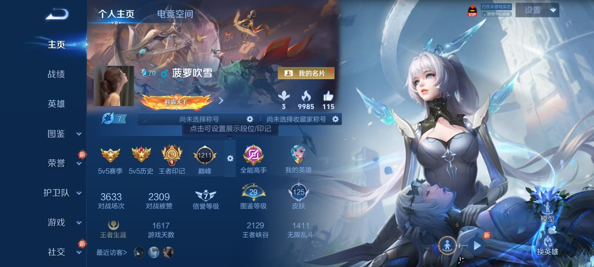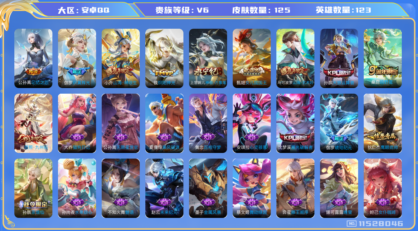 [11528046]V6 6传说 123英雄 125皮肤 可修改实名 优质装备:炽阳神光,山海·琳琅生(小乔年限),炽翼辉光(娃娃菜牛角包),记忆之芯(机甲兔) 珍宝阁皮:蔷薇恋人 限定皮:愿照·九州拓(澜年限),鸣野蒿,天狼运算者,女儿国国王,神器·万象笔,山海·玄木吟(马可年限) 史诗皮:茶境仙,琥珀纪元伽罗,百相守梦-黄忠,黄金分割率,魅语,蒙恬荣光圣徽,无限星赏官,匿光破解者,偶像歌手,晚萤,猫狗日记-大乔,女仆咖啡,水果甜心,绅士熊喵,心灵骇客,舞动绿茵,乘风破浪,金属风暴,鹰眼统帅,魅力维加斯,滕王阁序,未来纪元-赵云