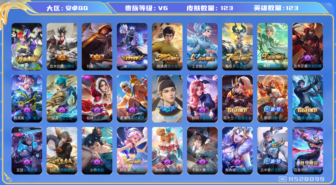 [11528099]V6 1珍品传说 4传说 123英雄 123皮肤 可修改实名 优质装备:时之恋人-刘备(电焊工),惊梅引,澜逐花归海 珍品传说:时之奇旅-孙策 珍宝阁皮:玩趣恶龙 限定皮:鸣野蒿,五谷丰年,梁祝,李小龙 史诗皮:谪仙醉月,破空之剑,百相守梦-百里守约,紫霞仙子,电玩小子(小书包),特工魅影,江河有灵,魅语,百解令(蒙犽),冰冠公主,青蛇,偶像歌手,电玩·爆裂旋风,节奏热浪,女仆咖啡,水果甜心,鬼剑武藏,心灵战警,纤云弄巧,拒霜思,乘风破浪,水晶猎龙者,曙光守护者,圣诞恋歌,鹰眼统帅,魅力维加斯,天秀·音浪