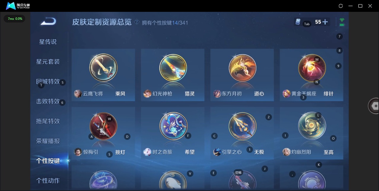 黄忠烈魂,曹操天狼征服者,伽罗天狼溯光者,张飞虎魄,孙膑天狼运算者,司空震愿照·山河定,裴擒虎李小龙,上官婉儿梁祝,上官婉儿天狼绘梦者,桑启鸣野蒿,女娲愿照·千秋盛,孙悟空至尊宝,赵云引擎之心,妲己愿照·众生和,韩信逐梦之影,蔡文姬愿照·福禄聚,澜愿照·九州拓,虞姬愿照·岁时盈,关羽武圣,关羽冰锋战神