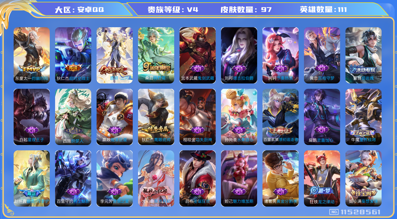 [11528561]V4 4传说 111英雄 97皮肤 可修改实名 优质装备:超时空战士-狄仁杰,灼幽烈阳 珍宝阁皮:妄想食味 限定皮:愿照·山河定(司空震年限),鸣野蒿 史诗皮:器灵·浮梦炉,灵蛊蚀心,星界战将,龙之律动,东方月初,蒙犽顽岩魄,百相守梦-黄忠,织梦人,黄金分割率,特工魅影,节奏热浪,摇滚巨星,水果甜心,星夜王子,功夫厨神,德古拉伯爵,鬼剑武藏,逐浪之夏,原初追逐者,圣诞狂欢,鹰眼统帅,魅力维加斯