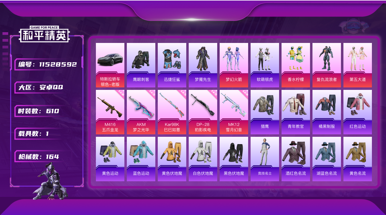 [11528592]5粉装 5特效枪 1载具 16印记 可二次 可修改实名 优质装备:特斯拉Model 3(冷光银),M416五爪金龙,梦幻火箭(新101)(新火箭少女101粉色套装),香水柠檬,AKM梦之光华,MK12-雪月幻音,Kar98K-巳巳如意 热门装扮:复仇流浪者,第五大道,软萌银虎,迅捷狂鲨,鹰眼刺客,梦魇先生 稀有枪皮:DP-28-豹影疾电 六级特效枪:六级M416-五爪金龙 五级特效枪:五级Kar98K-巳巳如意,五级DP-28-豹影疾电,五级AKM-梦之光华 四级特效枪:四级MK12-雪月幻音 紫色装扮:田园牧歌,轻风白浪,SS22特训,SS23特训,幻彩翩翩,灵蜜圈圈,妙红点点,娇憨猪猪,暖心橘喵,萌趣咩咩,SS21特训,熠彩粉晶,SS31特训套装,人气偶像,六六大吉,冰川特警,冷焰舞者,北国孤狼,千禧之恋,SS30特训套装,SS33特训套装,SS20特训,SS15特训,SS16特训,冰爽海盐,银白舞王,SS13特训,浪漫樱花,治愈之星,科技之星,SS14特训,怪笑疯兔,萌趣颜团子,特种颜团子,飞驰魅影,音速流光,SS19特训,豚鼠丹丹,吉莉礼服,瑞龙福将,团圆交子,SS17特训,SS18特训,都市魅力,酒红色名流,酷潮明星,野性战心,长空猛禽,雪山精英,霓虹街区,青年教官,青春校园,缤纷果语,耀眼新星,荣耀,蓝彩潮人,蓝色运动,虎虎生威吉莉,街头潮人,飞行日记,魅力单车,鹤鸣,麻辣教官,黄色伏地魔,黄色名流,黄色运动,黎明保卫者,黑色伏地魔,龟仙人,冰河战士,沙漠毒蛇,极地朋克,极速红龙,柠萌假日,橘黑制服,沙漠兵团,海岛探路者,涂山之恋,深蓝色名流,滨海假日,幻影武者,夏日音浪,完美偶像,帅气教官,幻世战舞者,怒火燎原,战地督导,战地菁英,探宝勇士,湖蓝色名流,滨海厨神,绮丽涂鸦,白色伏地魔,破晓战魂,破蛋小黄鸡,福星高照,空岛之星,空投萌叽,竞技勇士朋克,竞技达人朋克,红色运动,王牌教练,牛气冲天,灼焰舞者,炫蓝之夏,热血青春,牛气满满,猛禽,特战装甲,特殊使命,特训学院,猎鹰,镭射皇者,静谧青瓷,SS29特训,SS28特训,异域银装,鱼渊荷华,玉兔迎春,燕燕于飞,竞技名士,深海梦境,SS24特训(SS24特训套装),SS25特训,SS27特训,浪漫天命,小丑鱼,SS26特训,SS6特训,SS7特训,SS8特训,原初圣火,逆风勇士,SS12特训,SS9特训