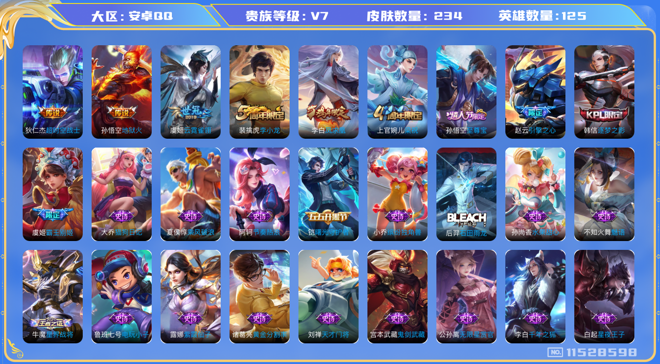 - [11883287]V7 6传说 123英雄 223皮肤 可修改实名 优质装备:久胜战神,云霓雀翎,胖达荣荣,超时空战士-狄仁杰 珍宝阁皮:优雅恋人,蔷薇恋人 限定皮:逐霄战戟,鸣野蒿,山海·碧波行(瑶年限),高山流水,怒海麟威,五谷丰年,逐梦之音,匿光启智者,时之奇旅-妲己,山海·玄木吟(马可年限) 史诗皮:化蝶舞,破空之剑,战舞者,琥珀纪元伽罗,决胜骁骑,蔬乡物语(鲁班七号),百相守梦-百里守约,百相守梦-黄忠,紫霞仙子,黄金分割率,特工魅影,千年之狐,江河有灵,匿光侦查者,雪夜绮愿(周瑜),百解令(蒙犽),高渐离燃音魔法,无限星赏官,偶像歌手,白蛇,电玩·爆裂旋风,暗夜猫娘,龙骑士(小龙虾),末日机甲-吕布,猫狗日记-孙策,猫狗日记-大乔,时之恋人-孙尚香,乱世虎臣,节奏热浪,女仆咖啡,水果甜心,星夜王子,心灵骇客,功夫厨神,暗隐猎兽者,幽灵船长,鬼剑武藏,心灵战警,天秀·启明,舞动绿茵,地狱岩魂,纤云弄巧,拒霜思,缤纷独角兽,乘风破浪,水晶猎龙者,曙光守护者,箭羽风息,金属风暴,圣诞狂欢,鹰眼统帅,暗夜贵公子,魅力维加斯,无心,未来纪元-赵云