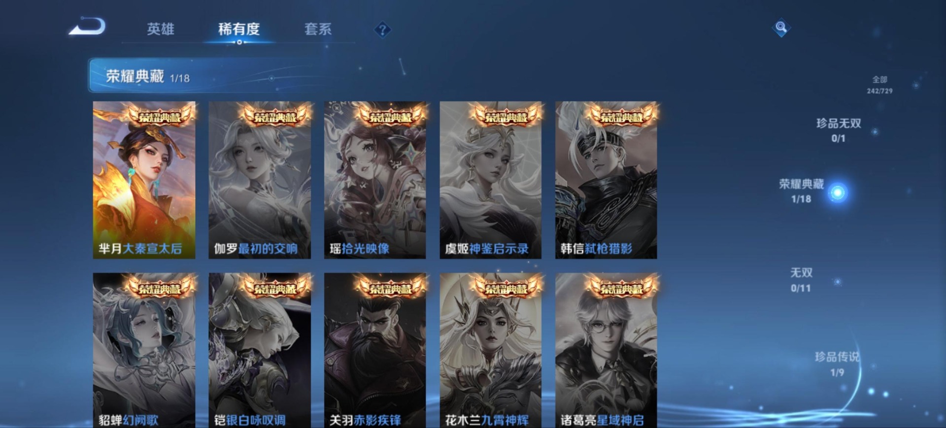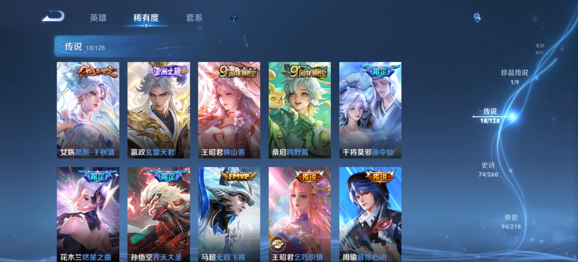 刘备时之恋人,铠绛天战甲,干将莫邪画中仙,李信一念神魔,王昭君乞巧织情,周瑜音你心动,嬴政玄雷天君,马超无双飞将,虞姬云霓雀翎