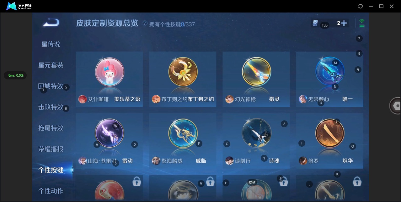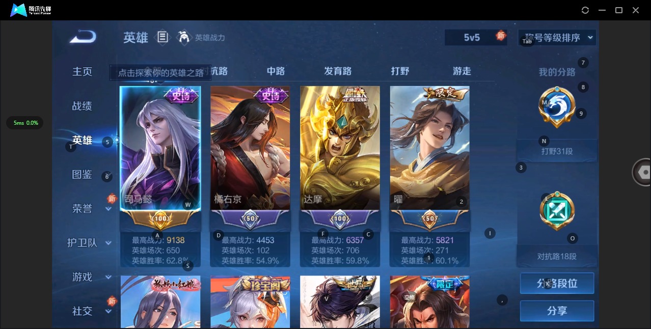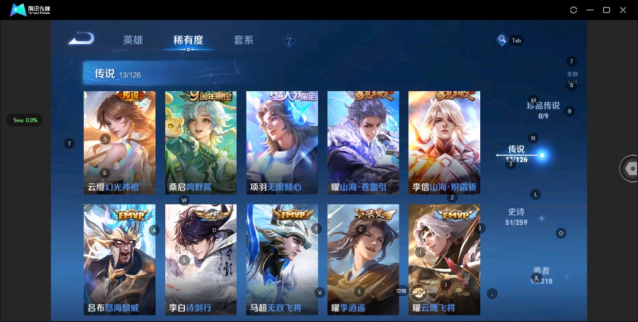 - PX_2081174-贵族等级: V4 英雄数: 121 皮肤数: 158 传说皮: 无双飞将,山海·炽霜斩,山海·苍雷引,幻光神枪 限定皮: 梁祝,引擎之心,飞衡,天狼狩猎者,孙行者,五谷丰年,诗剑行,山海·玄木吟,鸣野蒿,愿照·九州拓