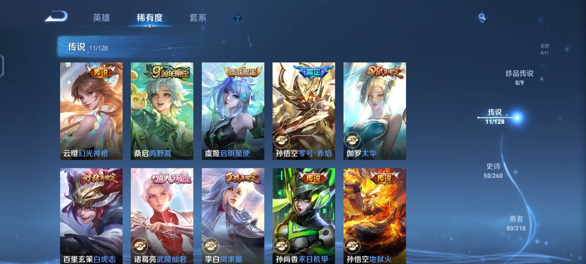 伽罗太华,后羿辉光之辰,露娜一生所爱,裴擒虎李小龙,裴擒虎天狼狩猎者,上官婉儿梁祝,花木兰青春决赛季,安琪拉魔法小厨娘,桑启鸣野蒿,孙悟空大圣娶亲,孙悟空至尊宝,百里玄策白虎志,妲己时之彼端,王昭君凤凰于飞
