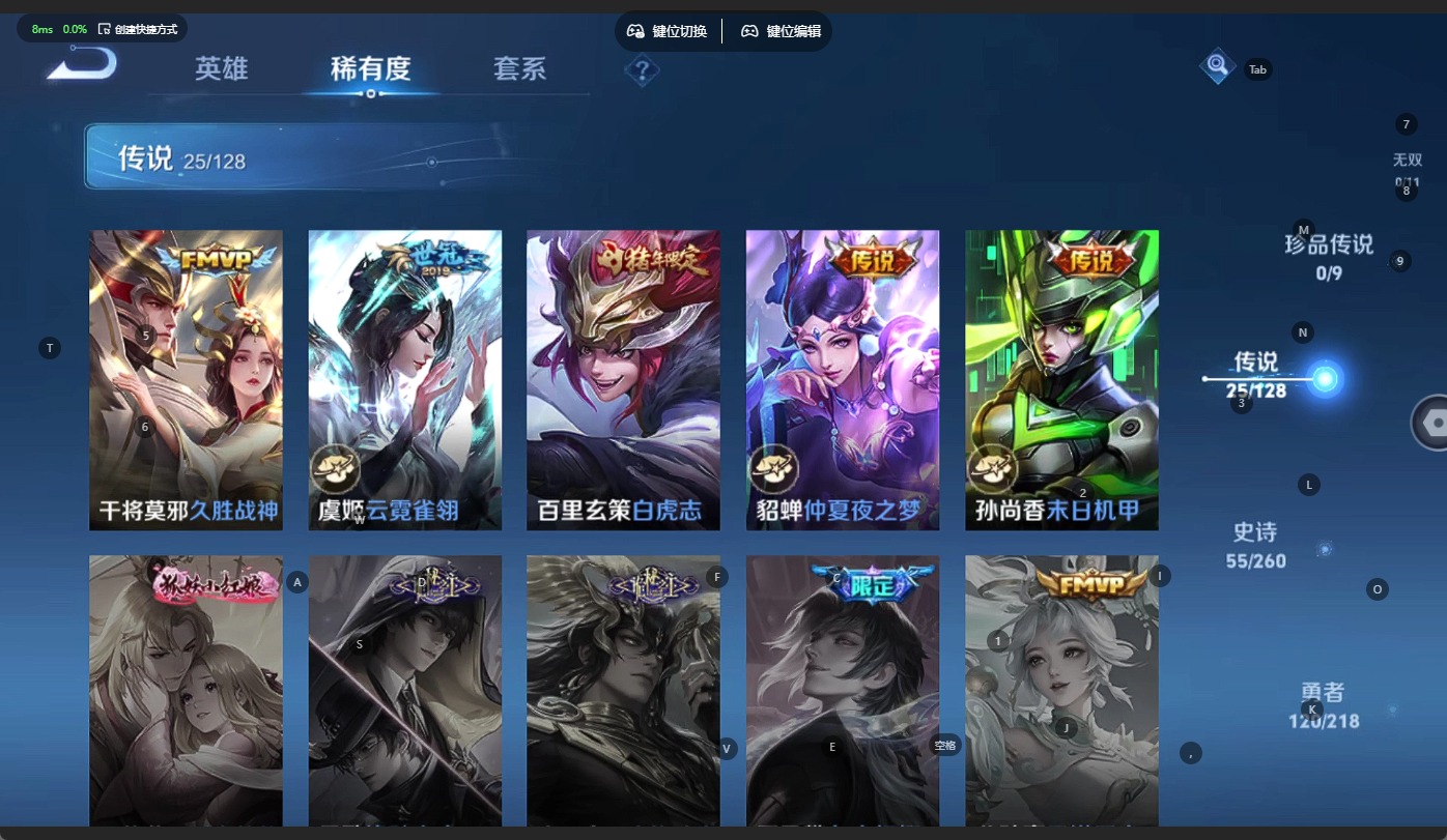 [11528788]V8 1典藏 25传说 125英雄 250皮肤 可修改实名 优质装备:鸣剑·曳影,云鹰飞将(小将军),久胜战神,炽阳神光,一念神魔,云霓雀翎,末日机甲-孙尚香(绿蚂蚱),仲夏夜之梦(大飞蛾),游龙清影(小青龙),淬星耀世,碎云,神器·狴犴令,浮生妄,追逃游戏(亚瑟),澜逐花归海 传说皮:乘龙·问璇玑(孙尚香年限),乘龙·铭钟鼎(赵云年限),乘龙·淬吴钩(孙策年限),幻光神枪 珍宝阁皮:万物之道,女武神 限定皮:愿照·九州拓(澜年限),鸣野蒿,至尊宝,白虎志(电光耗子),时雨天司(水龙头),神威(电光马子),飞衡(韩信年限),遇见飞天,诗剑行,祈雪灵祝(雪兔子),李小龙,默契交锋-花木兰 史诗皮:化蝶舞,星界战将,龙之律动,乘龙·聚宝船(安琪拉年限),乘龙·忆丹青(大乔年限),紫霞仙子,黄金分割率,千年之狐,魅语,偶像歌手,晚萤,电玩·爆裂旋风,末日机甲-吕布,时之恋人-孙尚香,乱世虎臣,修罗,女仆咖啡,摇滚巨星,水果甜心,绅士熊喵,心灵骇客,功夫厨神,德古拉伯爵,暗隐猎兽者,幽灵船长,鬼剑武藏,心灵战警,地狱岩魂,纤云弄巧,逐浪之夏,水晶猎龙者,曙光守护者,原初追逐者,圣诞狂欢,圣诞恋歌,鹰眼统帅,魅力维加斯,未来纪元-赵云