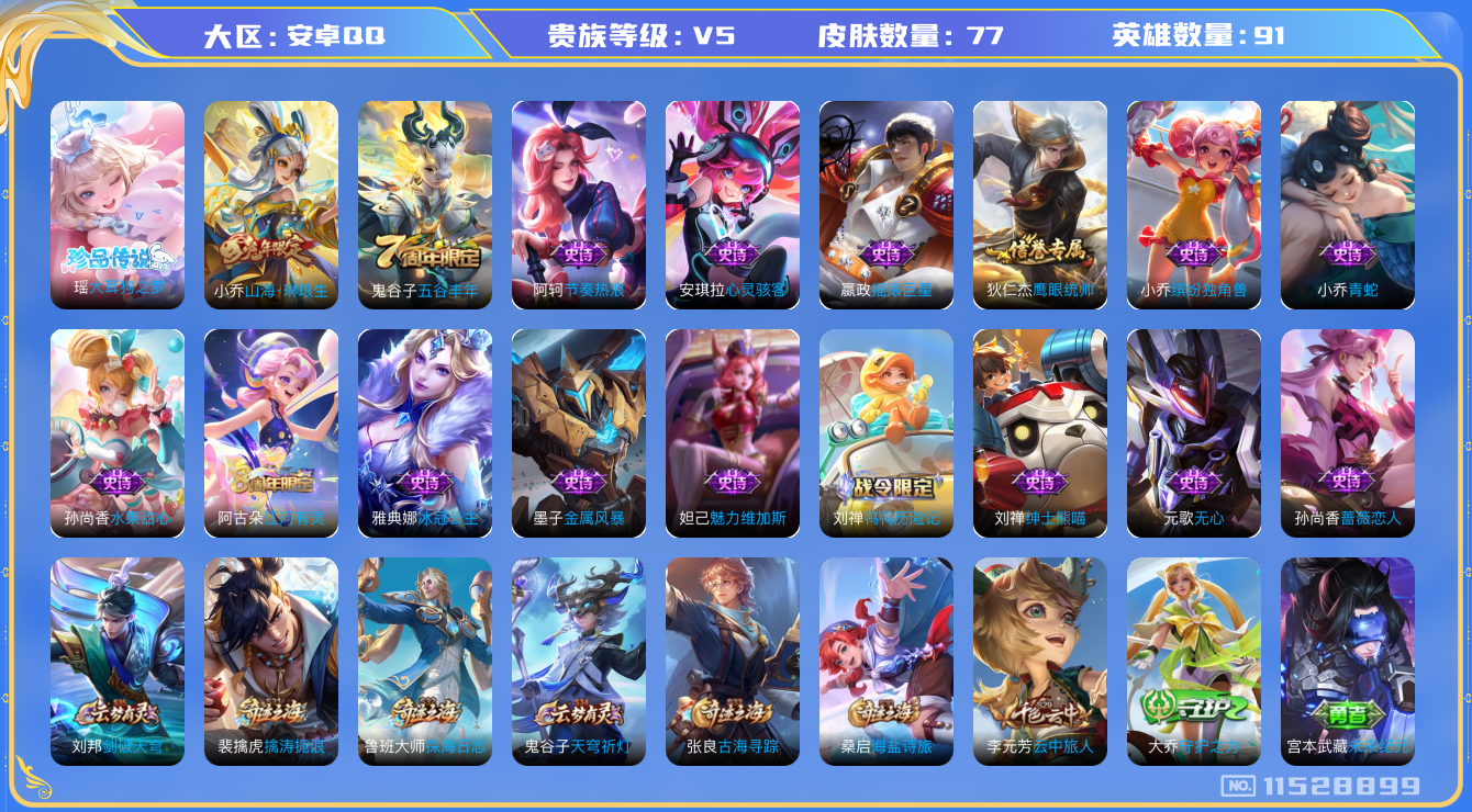 [11528899]V5 1珍品传说 1传说 91英雄 77皮肤 可修改实名 优质装备:大耳狗之梦,山海·琳琅生(小乔年限) 珍宝阁皮:蔷薇恋人 限定皮:五谷丰年 史诗皮:鸭鸭历险记-刘禅,江河有灵,冰冠公主,青蛇,节奏热浪,摇滚巨星,水果甜心,绅士熊喵,心灵骇客,缤纷独角兽,金属风暴,鹰眼统帅,魅力维加斯,无心