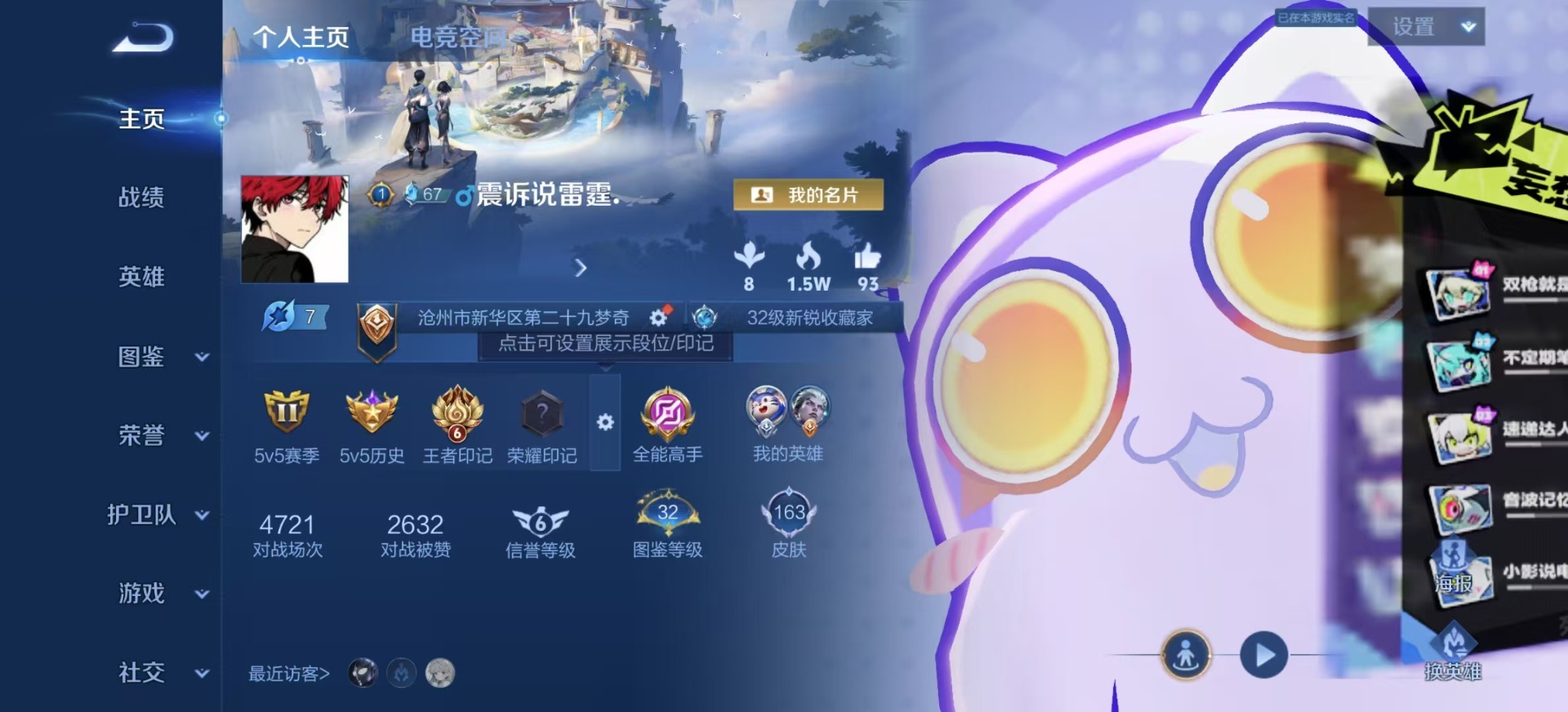 [11528918]V7 4传说 123英雄 163皮肤 可修改实名 优质装备:云霓雀翎,零号·赤焰,胖达荣荣,超时空战士-狄仁杰 珍宝阁皮:妄想食味,胡桃夹子 限定皮:高山流水,游园惊梦,李小龙,孙行者,山海·玄木吟(马可年限) 史诗皮:百相守梦-黄忠,遇见神鹿,电玩小子(小书包),白龙吟,江河有灵,猫狗日记-孙策,节奏热浪,修罗,女仆咖啡,水果甜心,星夜王子,心灵骇客,幽灵船长,鬼剑武藏,缤纷独角兽,乘风破浪,逐浪之夏,月团寄思,曙光守护者,热力回旋,金属风暴,鹰眼统帅,魅力维加斯,无心