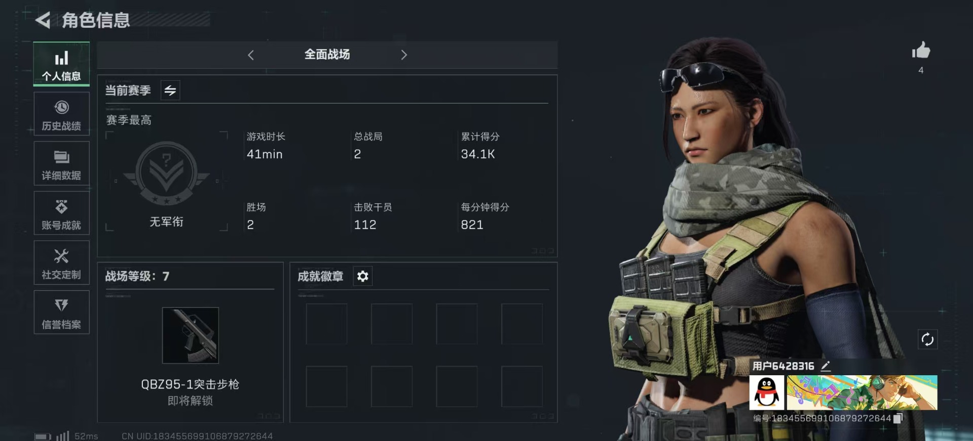 - PX_2101716-苹果QQ 历史总热力值:33157 粉装数量:5 特效枪数量:5 载具数量:2 王牌印记:5 历史最高段位:超级王牌6星 套装数量:66 时装数量:257 枪械数量:100 战备数量:64 装备数量:128 载具:布加迪威龙(海洋蓝),护世瑞兽 时装:套装-幻彩电音,套装-智能音符,角色-圣堂之誓,角色-女娲灵识,角色-星梦奇缘,套装-Alan Walker,套装-SS26特