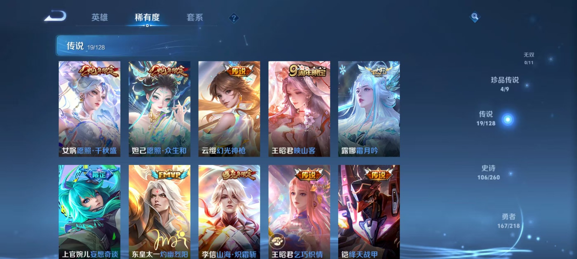 - PX_2097805-贵族等级: V7 英雄数: 40 皮肤数: 28 传说皮: 一念神魔,云诺千山 限定皮: 诗剑行
