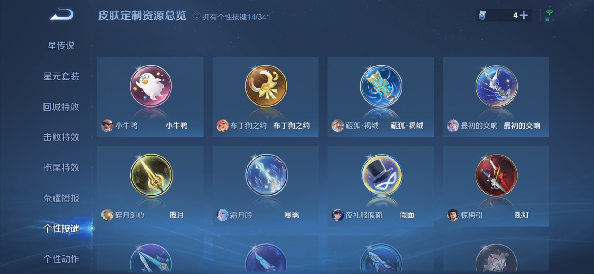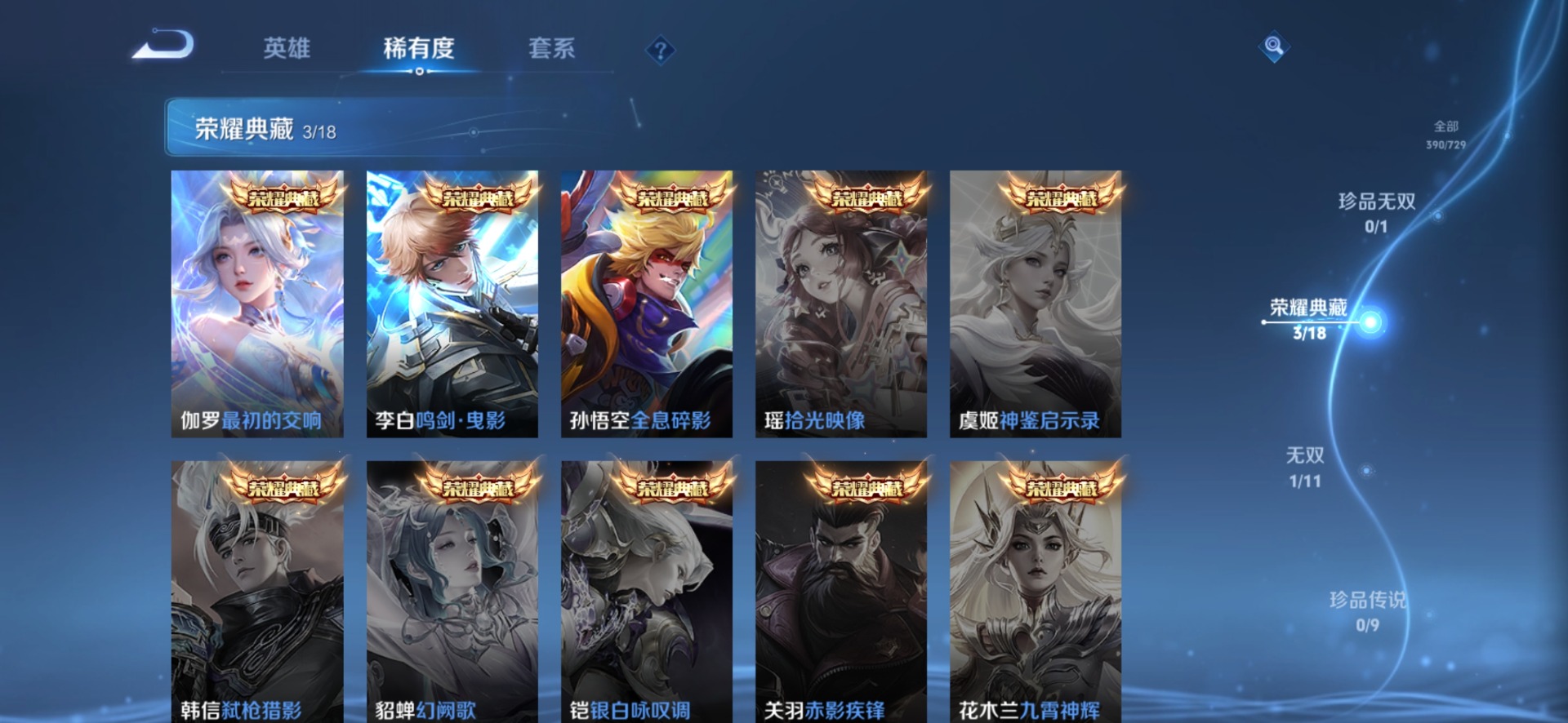 大乔白鹤梁神女,甄姬幽恒,廉颇寅虎·御盾,伽罗天狼溯光者,赵云百木心枪,干将莫邪冰霜恋舞曲,孙尚香异界灵契,后羿如梦令,露娜启示之音,后羿辉光之辰,露娜一生所爱,周瑜真爱至上,诸葛亮时雨天司,杨玉环寅虎·心曲,公孙离玉兔公主,公孙离蜜橘之夏,裴擒虎李小龙,裴擒虎寅虎·赤拳,上官婉儿梁祝,李白诗剑行,花木兰默契交锋,马可波罗逐梦之星,马可波罗深海之息,桑启鸣野蒿,猪八戒猪悟能,孙悟空孙行者,孙悟空大圣娶亲,孙悟空至尊宝,孙悟空美猴王,百里玄策白虎志,马超神威,韩信傲雪梅枪,韩信飞衡,韩信逐梦之影,百里守约朱雀志,嫦娥如梦令,关羽武圣,关羽冰锋战神