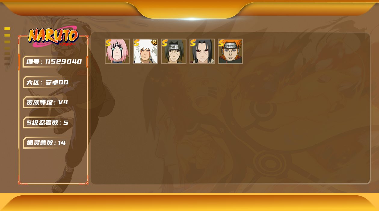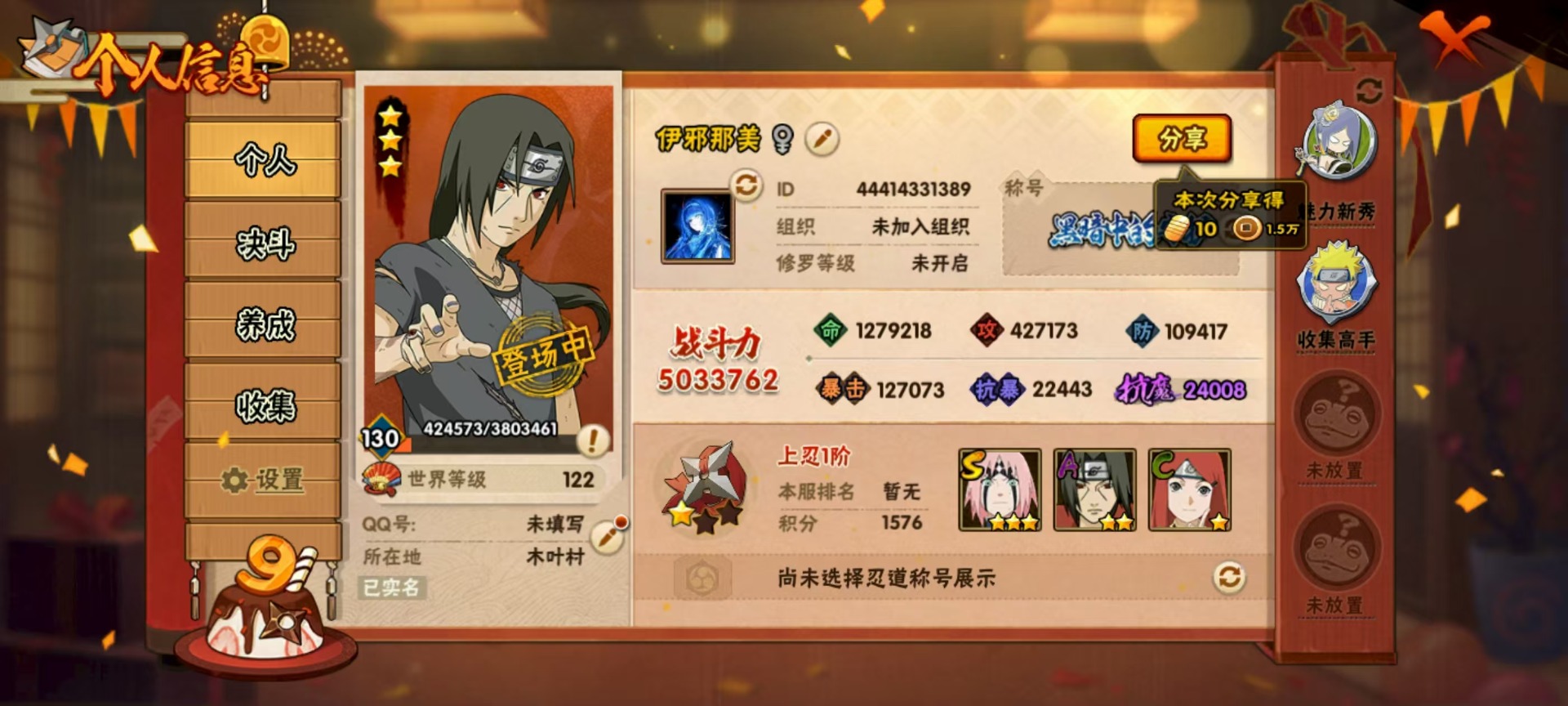 [11529040]V4 5S忍 12A忍 14通灵 503.3W战力 可二次 可修改实名 优质装备:宇智波鼬「秽土转生」,春野樱 「忍界大战」 S级忍者:自来也 「舞之豪杰」,宇智波鼬 「须佐能乎」,佩恩「天道」
