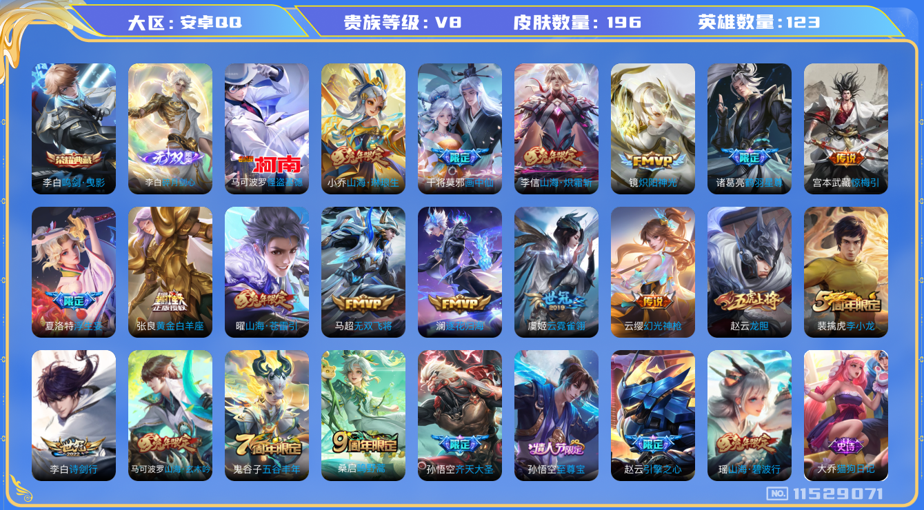 [11529071]V8 1典藏 1无双 1珍品传说 17传说 123英雄 196皮肤 可修改实名 优质装备:鸣剑·曳影,碎月剑心(李白无双),怪盗基德,黄金白羊座,炽阳神光,云霓雀翎,无双飞将,山海·炽霜斩(李信年限),山海·琳琅生(小乔年限),山海·苍雷引(电光曜子),画中仙,浮生妄,鹤羽星尊,惊梅引,澜逐花归海 传说皮:幻光神枪 珍宝阁皮:妄想食味 限定皮:鸣野蒿,至尊宝,山海·碧波行(瑶年限),诗剑行,齐天大圣,五谷丰年,龙胆,李小龙,引擎之心,山海·玄木吟(马可年限) 史诗皮:石田雨龙,破空之剑,蒙犽顽岩魄,琥珀纪元伽罗,蔬乡物语(鲁班七号),百相守梦-百里守约,紫霞仙子,苍穹之光,电玩小子(小书包),特工魅影,江河有灵,鹤归松栖(赵怀真),百解令(蒙犽),高渐离燃音魔法,蒙恬荣光圣徽,无限星赏官,匿光破解者,电玩·爆裂旋风,百相守梦(刘备),暗夜猫娘,末日机甲-吕布,猫狗日记-孙策,猫狗日记-大乔,乱世虎臣,节奏热浪,修罗,水果甜心,绅士熊喵,星夜王子,德古拉伯爵,暗隐猎兽者,鬼剑武藏,暗渊魔法,心灵战警,天秀·启明,纤云弄巧,乘风破浪,逐浪之夏,水晶猎龙者,曙光守护者,金属风暴,圣诞恋歌,鹰眼统帅,暗夜贵公子,魅力维加斯,天秀·音浪,无心,未来纪元-赵云