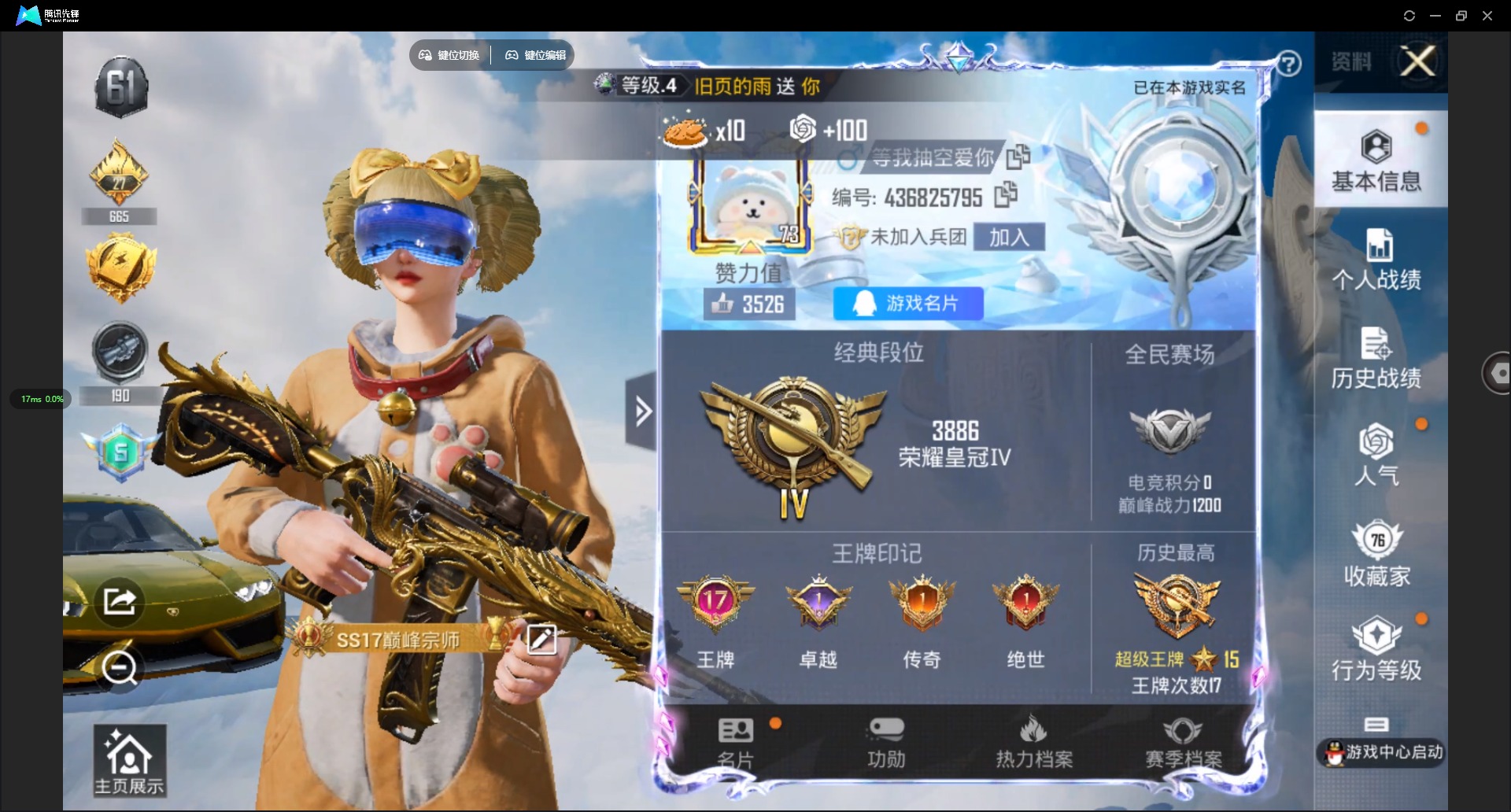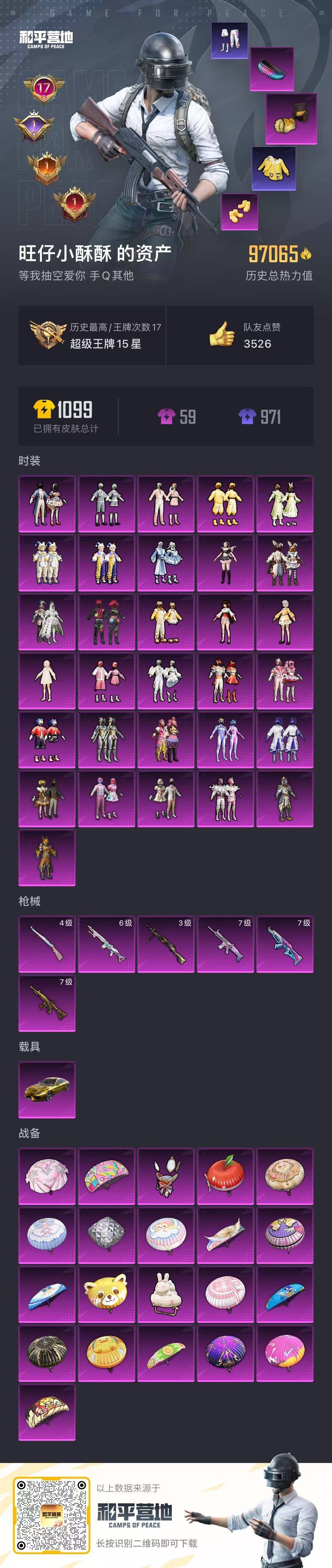 - PX_2096495-苹果QQ 历史总热力值:20215 粉装数量:8 特效枪数量:2 历史最高段位:不朽星钻Ⅴ 套装数量:43 时装数量:166 枪械数量:67 战备数量:40 装备数量:74 时装:套装-创世·救赎,套装-梦幻火箭,套装-甜心娃娃,套装-酣梦娃娃,角色-呆萌星弥,角色-小可学妹,角色-白勺歌姬,角色-鸢尾晶梦,套装-SS24特训,套装-SS27特训,套装-SS28特训,套装-冰