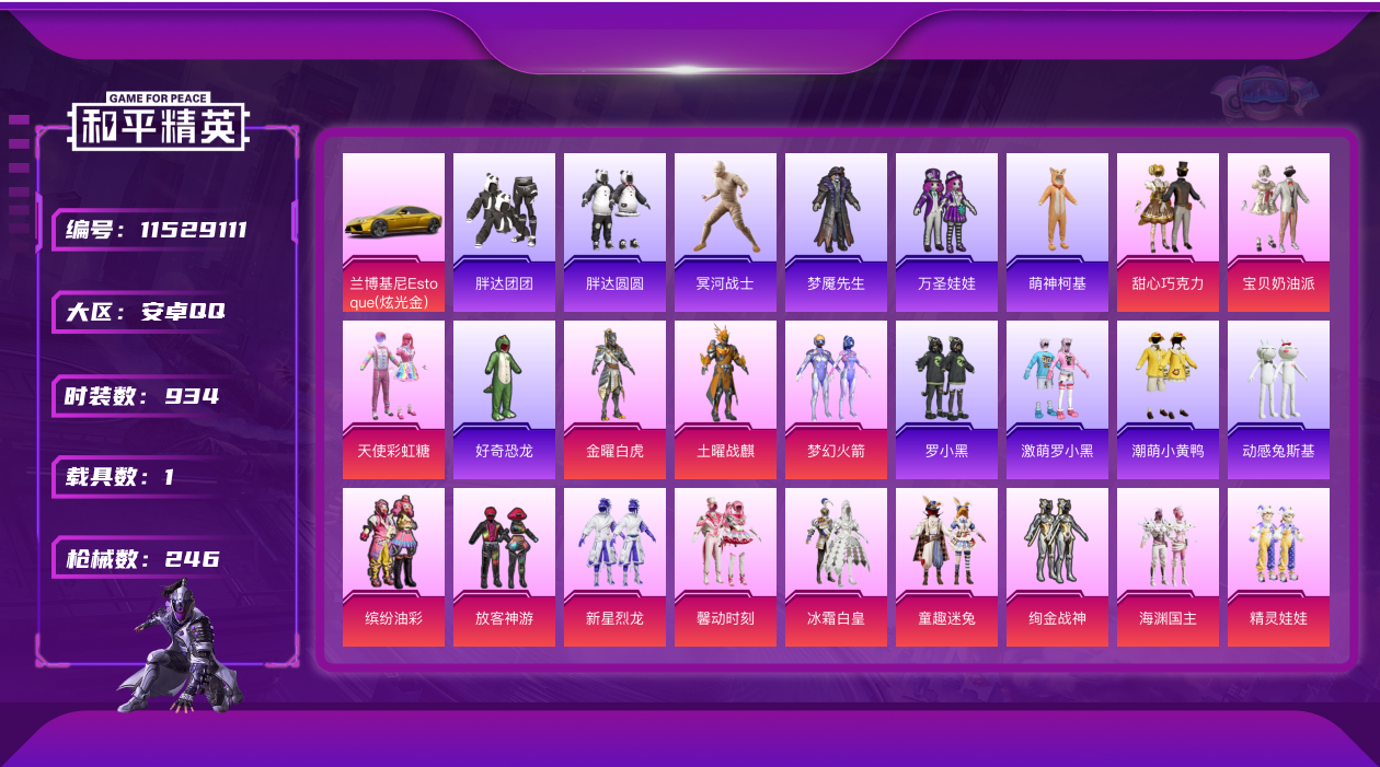 [11529111]31粉装 6特效枪 1载具 17印记 可二次 可修改实名 身法装备:暗影哥特(红眼罩),冥河战士(老木乃伊),KONE追光队服,萌熊伴侣背包(粉熊背包) 优质装备:冥河战士(老木乃伊),木乃伊套装(老)(冥河战士),兰博基尼Estoque(炫光金),甜心巧克力,萌熊伴侣背包(粉熊背包),M416五爪金龙,SCAR-L梦幻火箭,梦幻火箭(新101)(新火箭少女101粉色套装),宝贝奶油派,天使彩虹糖,放客神游,土曜战麒,金曜白虎,缤纷油彩(猪妹猪脸妹),绚金战神,冰霜白皇,新星烈龙(小白龙),童趣迷兔,AKM梦之光华,馨动时刻,DP-28暗夜鎏金,七级AKM-梦之光华,七级SCAR-L-梦幻火箭,七级M416-五爪金龙,Mk14精灵梦叶罗丽,绯果甜心,Kar98K-巳巳如意 热门装扮:精灵娃娃,酣梦娃娃,岚岚物语,海渊国主,霞光圣骑,寒光使者,暖熊萌萌,傲雪凌霜,音爆索尼克,第五大道,飒粉甜心,呆萌星弥,白勺歌姬,小可学妹,白兰星,闲梦青缨,暖暖奶龙,兔兔白日梦,动感兔斯基,胖达圆圆,胖达团团,萌神柯基,罗小黑,激萌罗小黑,潮萌小黄鸭,万圣娃娃,梦魇先生,好奇恐龙 六级特效枪:六级Mk14-精灵梦叶罗丽 四级特效枪:四级Kar98K-巳巳如意 三级特效枪:三级DP-28-暗夜鎏金 紫色装扮:田园牧歌,轻风白浪,SS22特训,莱茵河畔,SS23特训,幻彩翩翩,灵蜜圈圈,妙红点点,香榭午后,白兰地假日,娇憨猪猪,奶油香芋,樱桃黑巧,夏雨游龙,萌趣咩咩,暖心熊熊,SS21特训,绚烂繁星,熠彩粉晶,SS31特训套装,SS2特训,SS3特训,SS4特训,SS5特训,人气偶像,六六大吉,军械专家,冰原使者,,冰川特警,冷焰舞者,凛冬战士,刚毅裁决者,北国孤狼,千禧之恋,午夜朋克,S5赛事,S3赛事,极速光影,SS30特训套装,云朵鹅,雪绒豹,SS33特训套装,青涩时光,顶瓜瓜,SS20特训,SS14特训,SS19特训,粉团憨憨,软羊咩咩,天籁歌者,瑞龙福将,团圆交子,醒狮腾龙,SS17特训,糖果砰砰,异彩先驱,SS18特训,都市魅力,野性战心,野性战魂,金鼠迎春,长空猛禽,雪山征服者,雪山精英,雷霆特警,霓虹极客,霓虹街区,青年教官,迎春赐吉,风暴特警,缤纷果语,自由不朽乐队,苍影战舞者,荣耀,蓝彩潮人,蓝色守护者,蓝色运动,虎虎生威吉莉,跃动心情,青涩年华,魅力单车,鹤鸣
