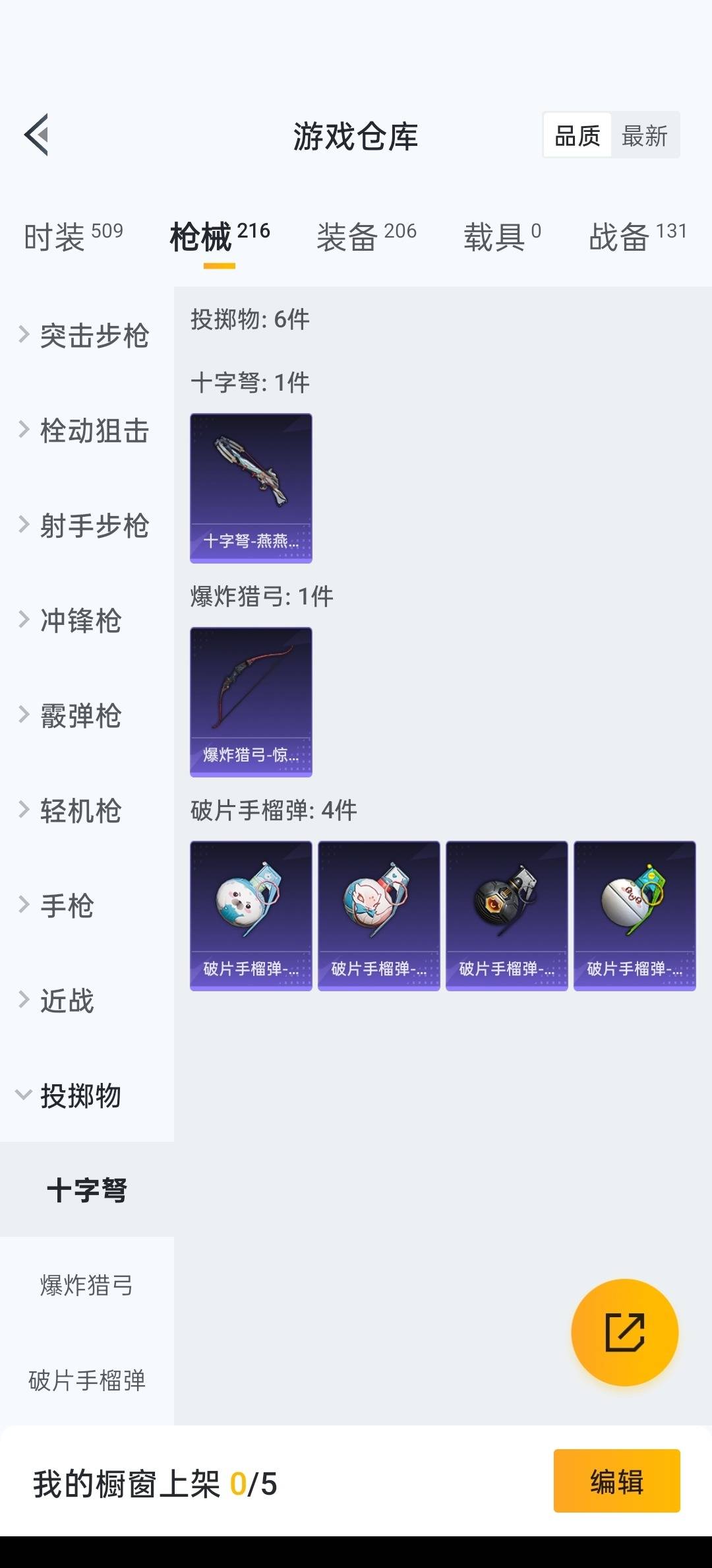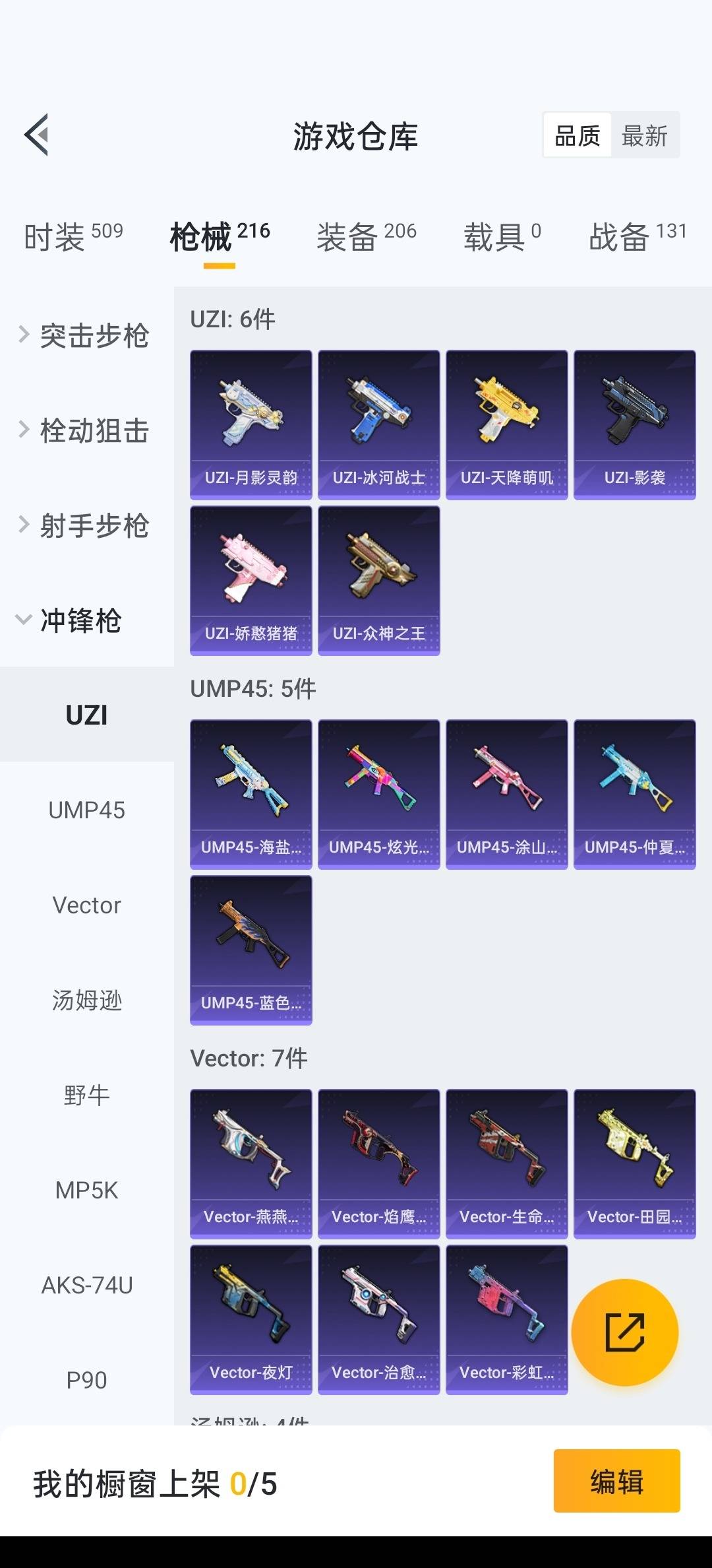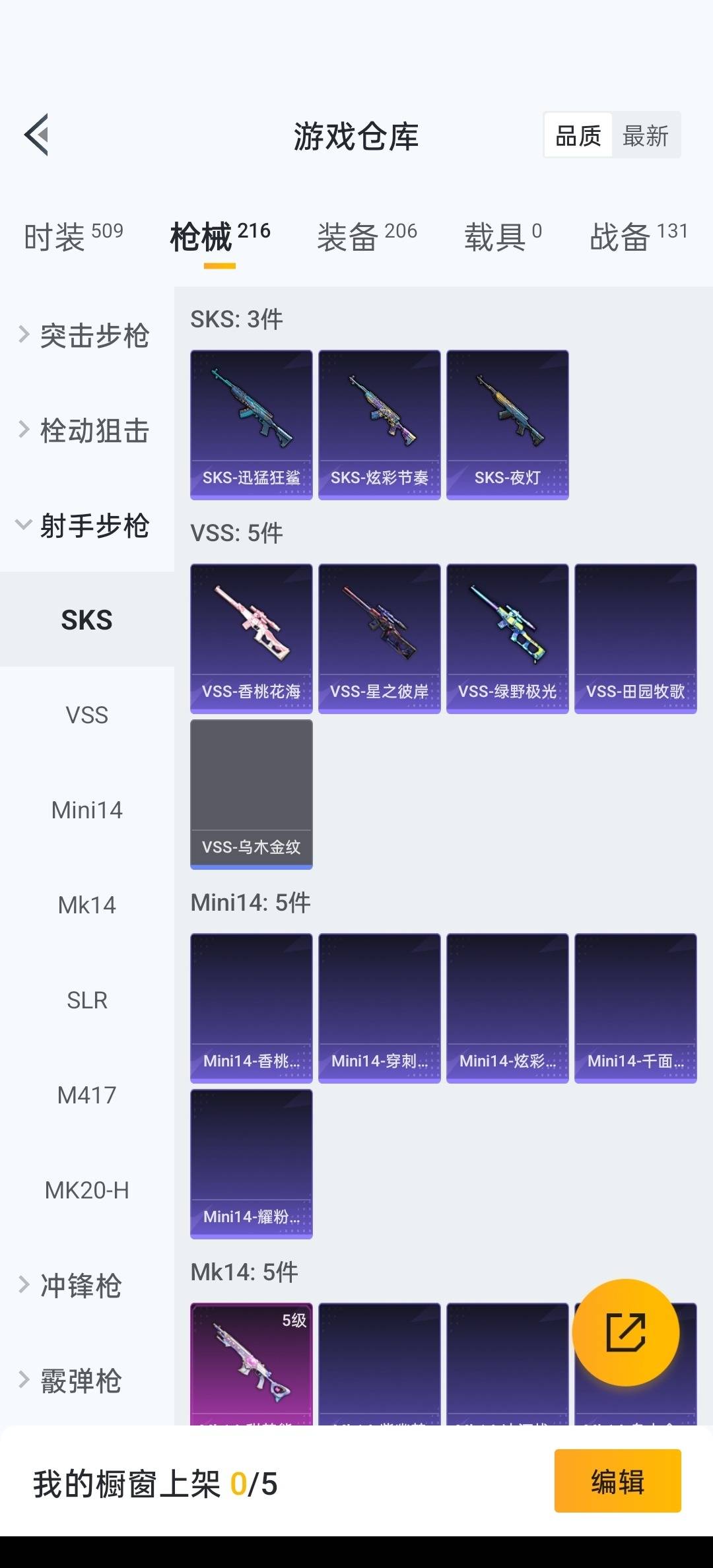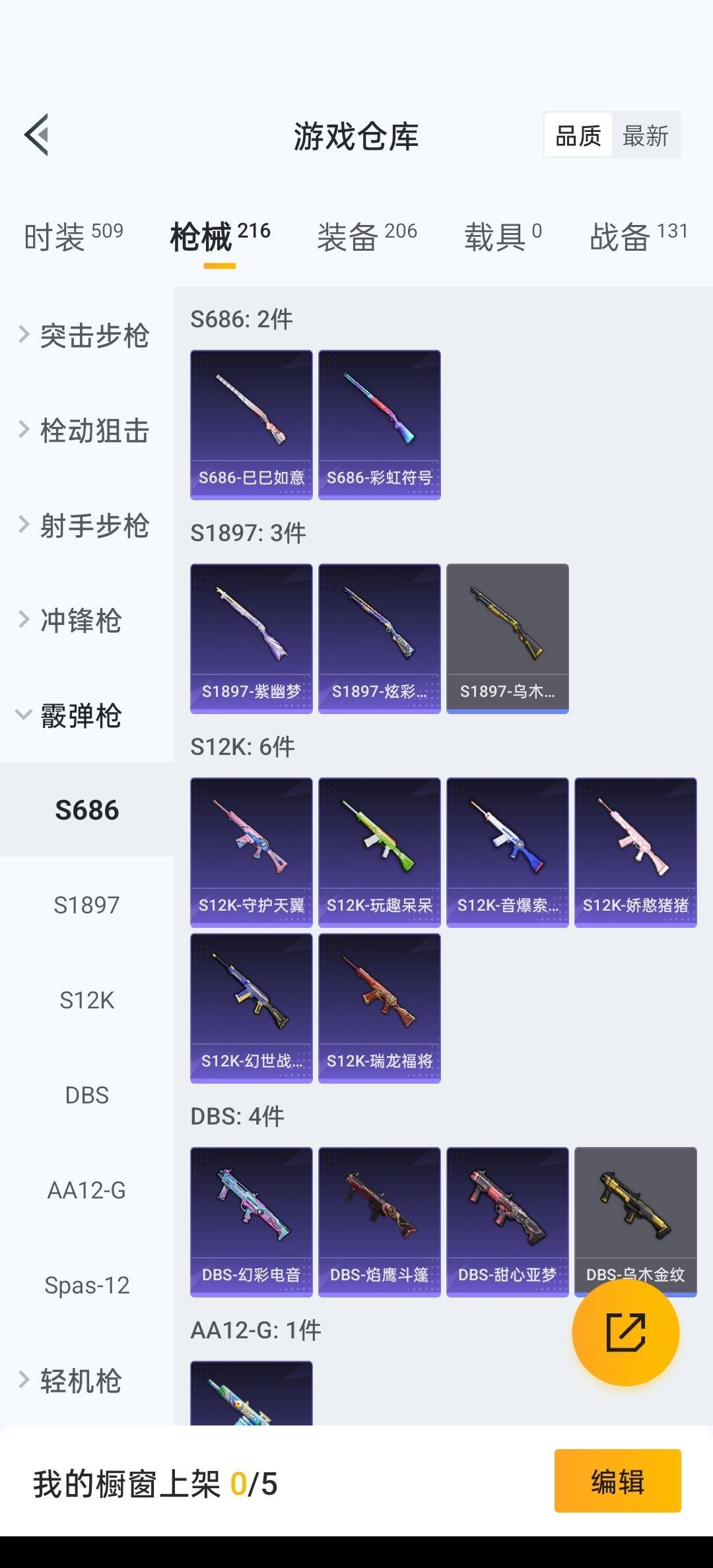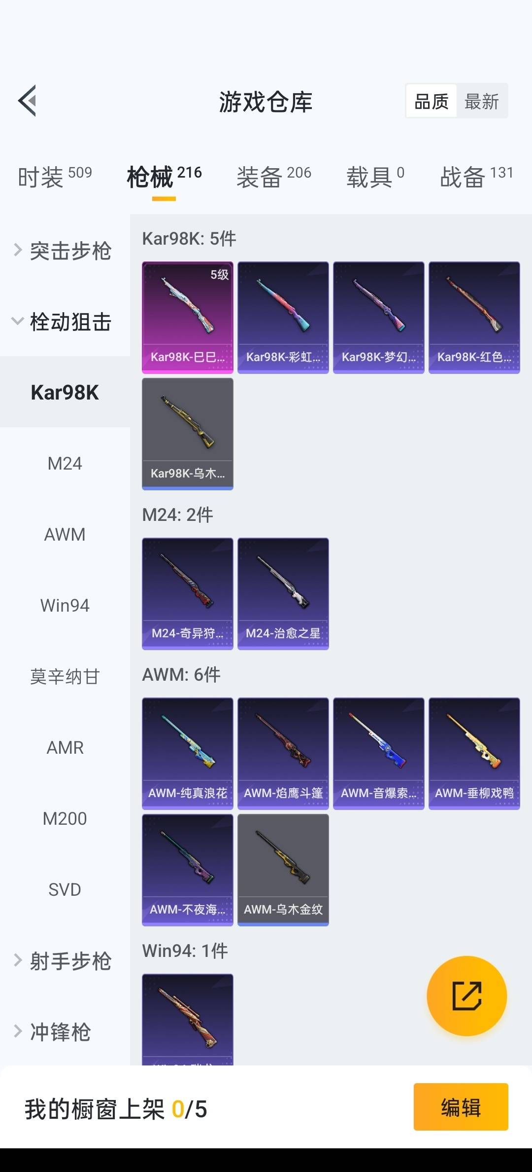 AKM-绿萝繁花,SCAR-L-锦绣绵绵,M416-电玩时刻,GROZA-镜光银凌,AUG-暖羊咩咩,Kar98K-巳巳如意,PKM-守护天翼