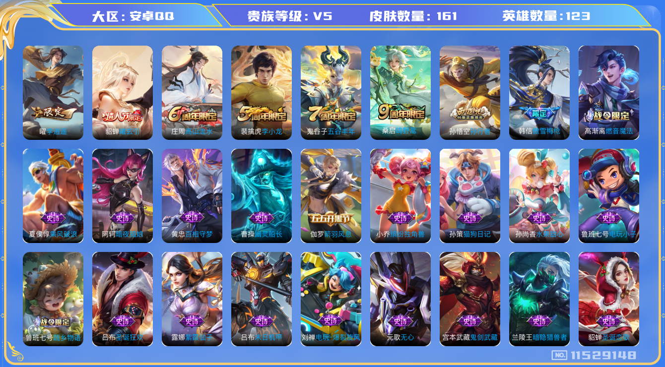 [11529148]V5 3传说 123英雄 161皮肤 可修改实名 女号 优质装备:李逍遥 传说皮:貂蝉曦玄引 珍宝阁皮:蔷薇恋人,玩趣恶龙 限定皮:鸣野蒿,傲雪梅枪,高山流水,五谷丰年,李小龙,孙行者 史诗皮:蔬乡物语(鲁班七号),百相守梦-黄忠,紫霞仙子,电玩小子(小书包),特工魅影,高渐离燃音魔法,蒙恬荣光圣徽,电玩·爆裂旋风,暗夜猫娘,末日机甲-吕布,猫狗日记-孙策,摇滚巨星,水果甜心,心灵骇客,暗隐猎兽者,幽灵船长,鬼剑武藏,舞动绿茵,诗语江南,缤纷独角兽,乘风破浪,热力回旋,箭羽风息,金属风暴,圣诞狂欢,圣诞恋歌,鹰眼统帅,魅力维加斯,无心