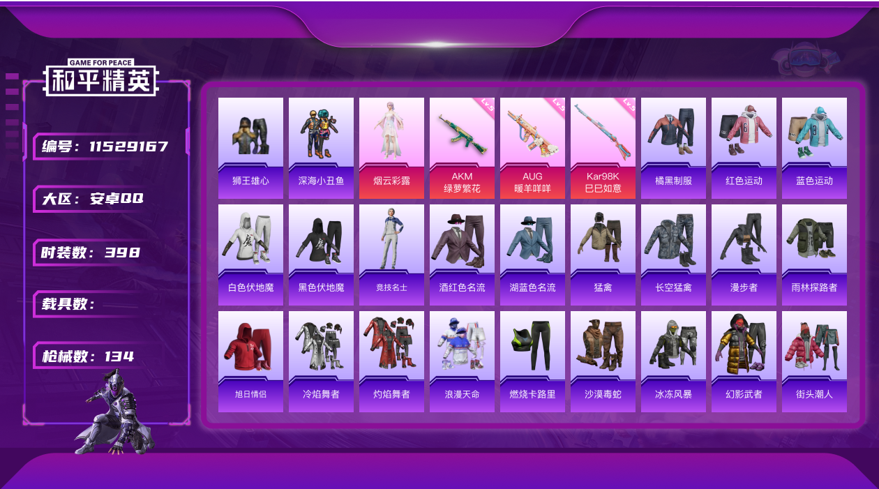 [11529167]1粉装 3特效枪 11印记 可二次 可修改实名 连体王者 身法装备:暗影哥特(红眼罩) 优质装备:AKM绿萝繁花,AUG-暖羊咩咩,Kar98K-巳巳如意 热门装扮:烟云彩露,狮王雄心,深海小丑鱼 五级特效枪:五级Kar98K-巳巳如意,五级AUG-暖羊咩咩,五级AKM-绿萝繁花 紫色装扮:田园牧歌,轻风白浪,和煦暖阳,SS22特训,SS23特训,娇憨猪猪,萌趣咩咩,SS21特训,SS31特训套装,冷焰舞者,凛冬战士,旭日情侣,SS30特训套装,SS33特训套装,SS20特训,快乐星愿,猎梦纪元,SS19特训,英勇保护者,甜心亚梦,虚音幻奏,SS18特训,酒红色名流,长空猛禽,雨林探路者,缤纷果语,荣耀,蓝彩潮人,蓝色运动,街头潮人,飞行日记,魅力单车,鹤鸣,麻辣教官,黑色伏地魔,龙的传人,龟仙人,冰河战士,龙魂突击队,沙漠毒蛇,柠萌假日,橘黑制服,沙漠兵团,深蓝色名流,清新柠檬,幻影武者,夏日音浪,幻世战舞者,探宝勇士,湖蓝色名流,白色伏地魔,破晓战魂,破蛋小黄鸡,红色运动,王牌教练,牛气冲天,灼焰舞者,炫蓝之夏,燃烧卡路里,牛气满满,猛禽,狂沙舞者,粉日山川,SS29特训,星途旅人,SS28特训,鱼渊荷华,玉兔迎春,燕燕于飞,巳巳如意,森林游猎者,风玲,竞技名士,暗影哥特(红眼罩),街头风暴,惊鸿侠骨,神气柴柴,懵萌河马,SS24特训(SS24特训套装),SS25特训,锦衣飞扬,SS27特训,蝶吟花词,浪漫天命,SS26特训,春光漫游,智谋强哥,大橘大利,蓝冰羽,紫幽梦,SS32特训服(SS32特训套装),绯格组合,白糯汤圆,恋语绒绒,漫步者,无烬之地,冰冻风暴,光之冒险 优质战备:橘柚倾心降落伞,环太平洋降落伞