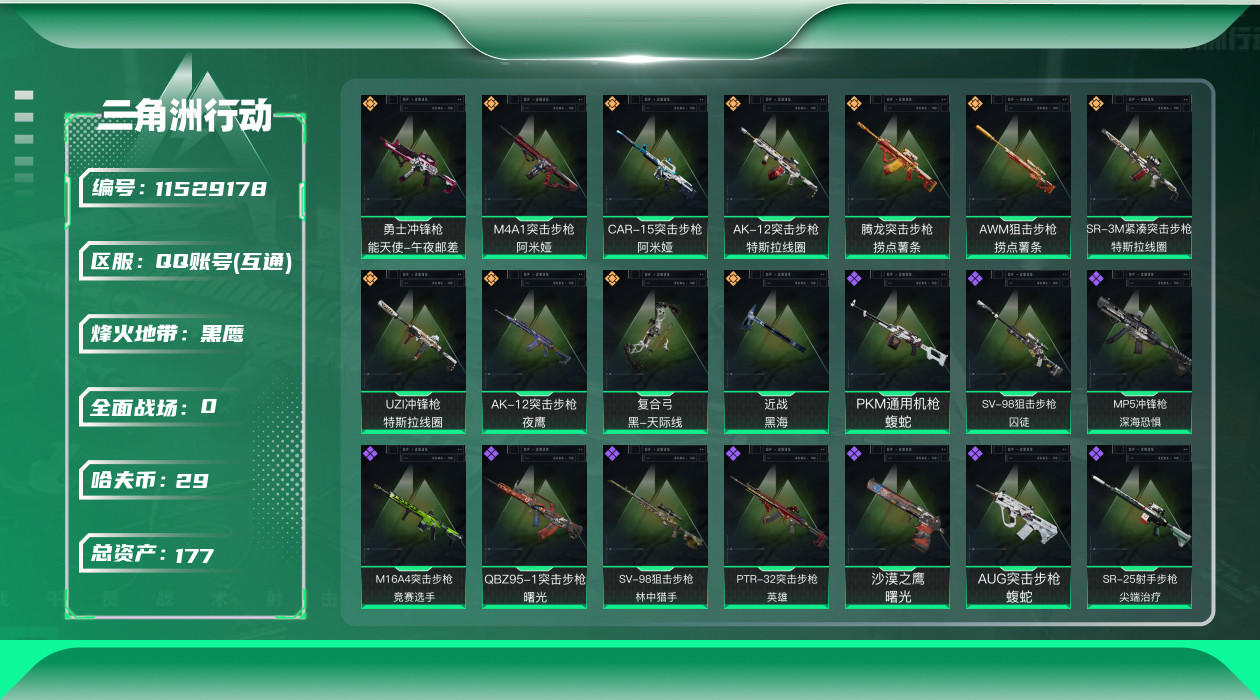[11529178]总资产:177.1M 1干员外观 1近战传说 11传说枪械 哈夫币:29.584K 顶级安全箱(3×3)9.15号到期 可二次 可修改实名 优质装备:近战-黑海,顶级安全箱(3x3) 烽火地带段位:黑鹰 全面战场段位:列兵 传说武器皮肤:AK-12突击步枪-夜鹰,AWM狙击步枪-捞点薯条,腾龙突击步枪-捞点薯条,AK-12突击步枪-特斯拉线圈,CAR-15突击步枪-阿米娅,SR-3M紧凑突击步枪-特斯拉线圈,UZI冲锋枪-特斯拉线圈,勇士冲锋枪-能天使-午夜邮差,复合弓-黑-天际线,M4A1突击步枪-阿米娅 史诗武器皮肤:AUG突击步枪-蝮蛇,PKM通用机枪-蝮蛇,Ash-12战斗步枪-守夜人,M16A4突击步枪-竞赛选手,PKM通用机枪-守夜人,AS Val突击步枪-尖端治疗,M700狙击步枪-守夜人,SG552突击步枪-尖端治疗,SR-25射手步枪-尖端治疗,MP5冲锋枪-深海恐惧,勇士冲锋枪-深海恐惧,AKM突击步枪-林中猎手,.357左轮-幸运时刻,M1014霰弹枪-林中猎手,SV-98狙击步枪-林中猎手,PTR-32突击步枪-英雄,SV-98狙击步枪-囚徒,M14射手步枪-黑鹰坠落,QBZ95-1突击步枪-曙光,沙漠之鹰-曙光,M700狙击步枪-竞技风 干员外观:露娜-黑·天际线