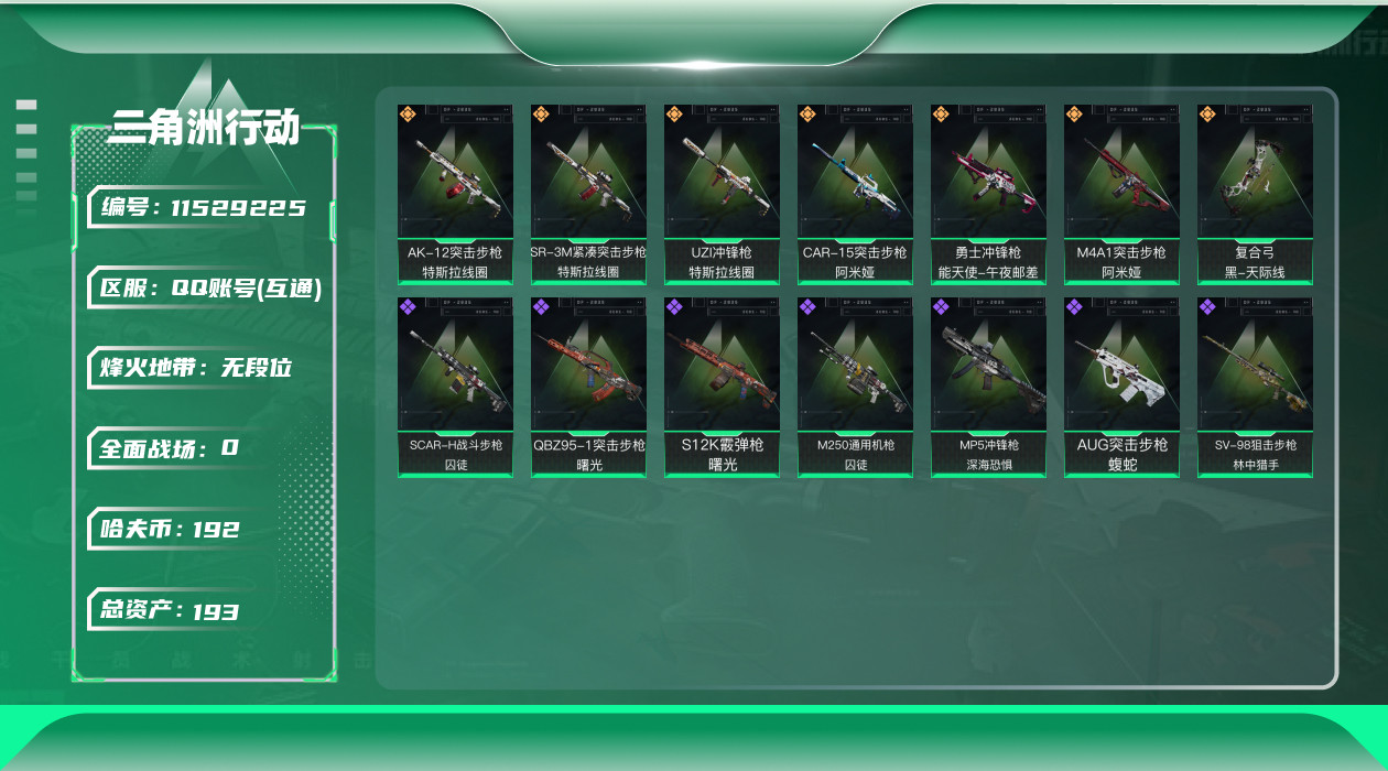[11529225]总资产:193.9M 7传说枪械 哈夫币:192K 进阶安全箱(2×2)9.15号到期 可二次 可修改实名 烽火地带段位:无段位 全面战场段位:无段位 传说武器皮肤:M4A1突击步枪-阿米娅,CAR-15突击步枪-阿米娅,复合弓-黑-天际线,AK-12突击步枪-特斯拉线圈,SR-3M紧凑突击步枪-特斯拉线圈,UZI冲锋枪-特斯拉线圈,勇士冲锋枪-能天使-午夜邮差 史诗武器皮肤:AUG突击步枪-蝮蛇,MP5冲锋枪-深海恐惧,SV-98狙击步枪-林中猎手,M250通用机枪-囚徒,SCAR-H战斗步枪-囚徒,QBZ95-1突击步枪-曙光,S12K霰弹枪-曙光