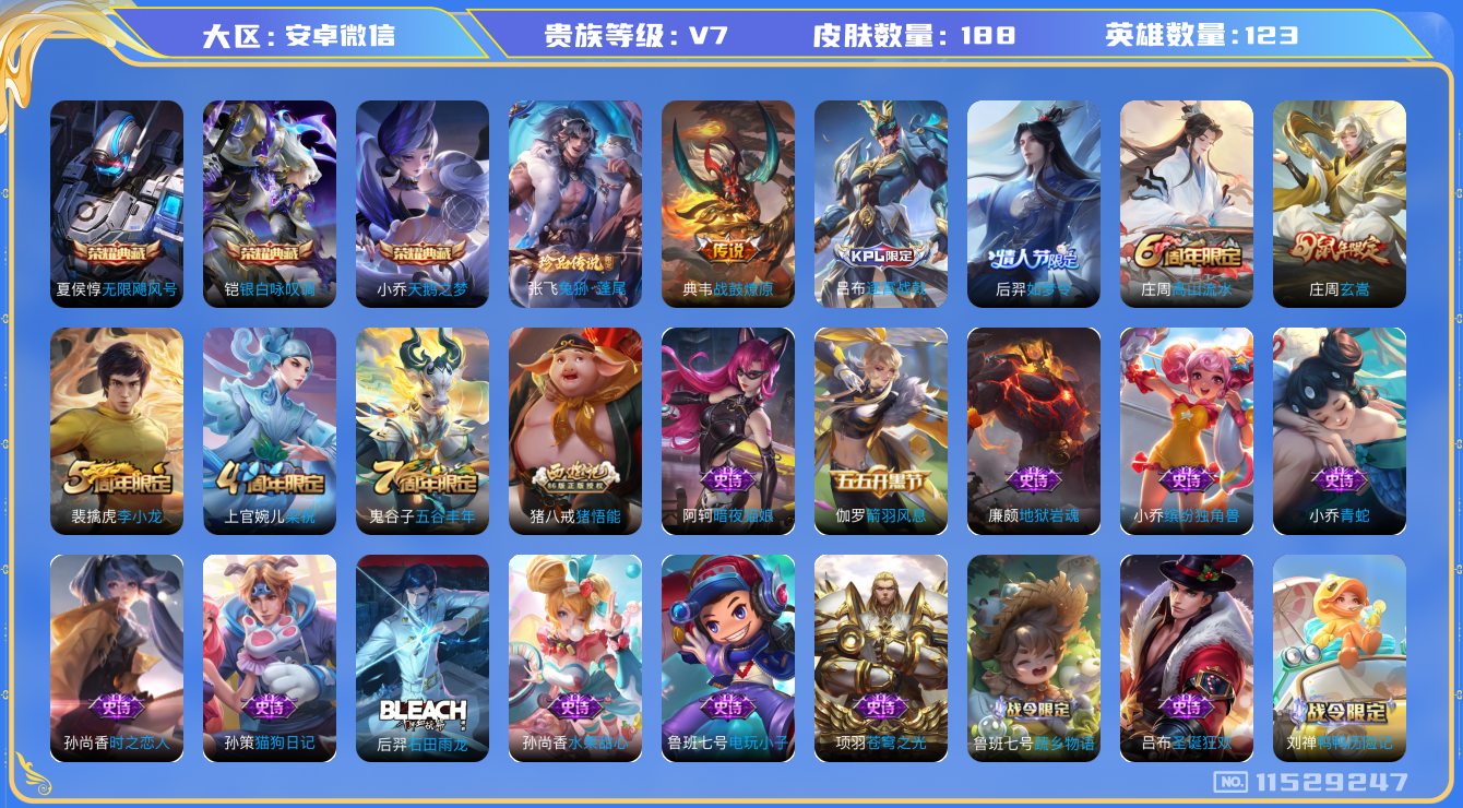[11529247]V7 3典藏 1珍品传说 1传说 123英雄 188皮肤 可修改实名 优质装备:天鹅之梦(小乔典藏),无限飓风号(高达),银白咏叹调(倪克斯侍卫) 珍品传说:兔狲·蓬尾 传说皮:典韦战鼓燎原 珍宝阁皮:胡桃夹子 限定皮:逐霄战戟,玄嵩(庄周年限),高山流水,五谷丰年,梁祝,李小龙,如梦令-后羿,猪悟能 史诗皮:鸭鸭历险记-刘禅,龙之律动,石田雨龙,蔬乡物语(鲁班七号),苍穹之光,电玩小子(小书包),电玩·爆裂旋风,蒙恬荣光圣徽,偶像歌手,龙骑士(小龙虾),暗夜猫娘,青蛇,猫狗日记-孙策,时之恋人-孙尚香,女仆咖啡,摇滚巨星,水果甜心,绅士熊喵,天才门将,心灵骇客,暗隐猎兽者,鬼剑武藏,乐园奇幻夜,地狱岩魂,繁星吟游(呼啦呼啦),缤纷独角兽,逐浪之夏,箭羽风息,金属风暴,原初追逐者,圣诞狂欢,鹰眼统帅,魅力维加斯,黎明之约,无心