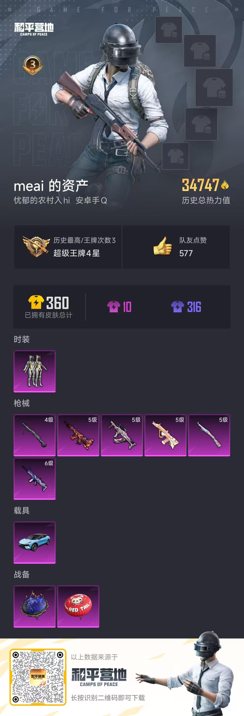 [11529376]1粉装 6特效枪 1载具 3印记 可二次 可修改实名 身法装备:暗影哥特(红眼罩),萌熊伴侣背包(粉熊背包) 优质装备:路特斯ELETRE(冰川蓝),萌熊伴侣背包(粉熊背包),绚金战神,M416风花雪月,SCAR-L青春物语,GROZA-镜光银凌,AUG-暖羊咩咩,Kar98K-巳巳如意 热门装扮:鹰眼刺客 稀有枪皮:DP-28-豹影疾电 六级特效枪:六级SCAR-L-青春物语 五级特效枪:五级GROZA-镜光银凌,五级Kar98K-巳巳如意,五级AUG-暖羊咩咩,五级M416-风花雪月 四级特效枪:四级DP-28-豹影疾电 紫色装扮:娇憨猪猪,萌趣咩咩,SS21特训,SS31特训套装,冷焰舞者,SS30特训套装,SS33特训套装,SS20特训,时空追击者,暴风机械师,银白舞王,SS14特训,怪笑疯兔,萌趣颜团子,特种颜团子,SS19特训,甜心亚梦,虚音幻奏,电音精灵,SS17特训,SS18特训,长空猛禽,缤纷果语,街头潮人,骑行爱好者,魅力单车,鹤鸣,黄色伏地魔,黄色名流,黑色伏地魔,沙漠兵团,海岛探路者,幻影武者,夏日音浪,完美偶像,帅气教官,幻世战舞者,探宝勇士,湖蓝色名流,绮丽涂鸦,疯狂小兔子,白色伏地魔,破晓战魂,甜蜜告白,牛气冲天,灰色格斗者,炫蓝之夏,猛禽,特殊使命,特训学院,猎鹰,镭射皇者,鱼渊荷华,玉兔迎春,燕燕于飞,巳巳如意,竞技名士,暗影哥特(红眼罩),裁决冥王,大橘大利,SS12特训,蓝冰羽,紫幽梦,SS32特训服(SS32特训套装),猎影月神,青玉碎影,萌黄之夏,恋语绒绒,金耀舞者,蓝调潮人 优质战备:星途旅人降落伞,鬼刀降落伞,阿狸红降落伞