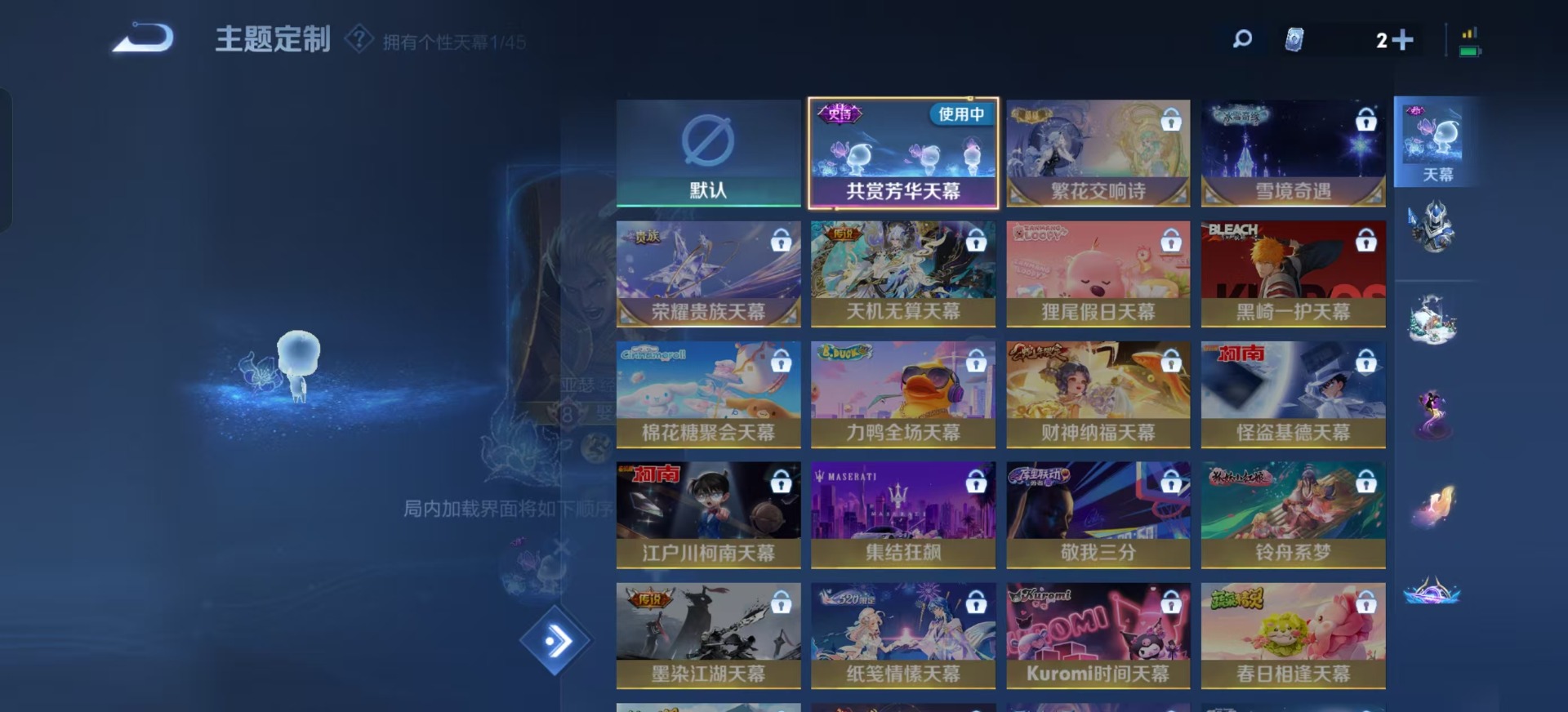 刘邦德古拉伯爵,夏侯惇乘风破浪,铠曙光守护者,曹操幽灵船长,伽罗箭羽风息,廉颇地狱岩魂,小乔缤纷独角兽,孙尚香时之恋人,孙策猫狗日记,赵怀真鹤归松栖,赵怀真器灵·浮梦炉,鲁班七号电玩小子,吕布圣诞狂欢,露娜紫霞仙子,吕布末日机甲,周瑜雪夜绮愿,诸葛亮黄金分割率,刘禅电玩·爆裂旋风,刘禅天才门将,刘禅绅士熊喵,宫本武藏鬼剑武藏,兰陵王暗隐猎兽者,貂蝉圣诞恋歌,花木兰水晶猎龙者,李白千年之狐,安琪拉心灵骇客,蒙犽百解令,白起星夜王子,亚瑟心灵战警,嬴政摇滚巨星,嬴政暗夜贵公子,莱西奥末日机甲,程咬金功夫厨神,百里玄策原初追逐者,雅典娜冰冠公主,百里守约特工魅影,李元芳逐浪之夏,墨子金属风暴,蔡文姬舞动绿茵,澜赏金猎手,王昭君偶像歌手,嫦娥拒霜思,钟馗乐园奇幻夜,橘右京修罗