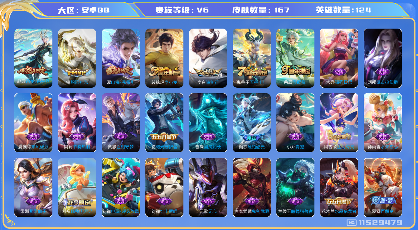[11529479]V6 5传说 124英雄 167皮肤 可修改实名 优质装备:炽阳神光,山海·苍雷引(电光曜子) 传说皮:乘龙·铭钟鼎(赵云年限) 珍宝阁皮:蔷薇恋人,玩趣恶龙 限定皮:鸣野蒿,诗剑行,五谷丰年,李小龙 史诗皮:鸭鸭历险记-刘禅,龙之律动,琥珀纪元伽罗,超元猎域,百相守梦-黄忠,紫霞仙子,特工魅影,江河有灵,百解令(蒙犽),青蛇,晚萤,电玩·爆裂旋风,猫狗日记-大乔,节奏热浪,修罗,水果甜心,绅士熊喵,星夜王子,功夫厨神,德古拉伯爵,暗隐猎兽者,幽灵船长,鬼剑武藏,舞动绿茵,乘风破浪,逐浪之夏,水晶猎龙者,曙光守护者,金属风暴,鹰眼统帅,暗夜贵公子,魅力维加斯,赏金猎手,无心,未来纪元-赵云