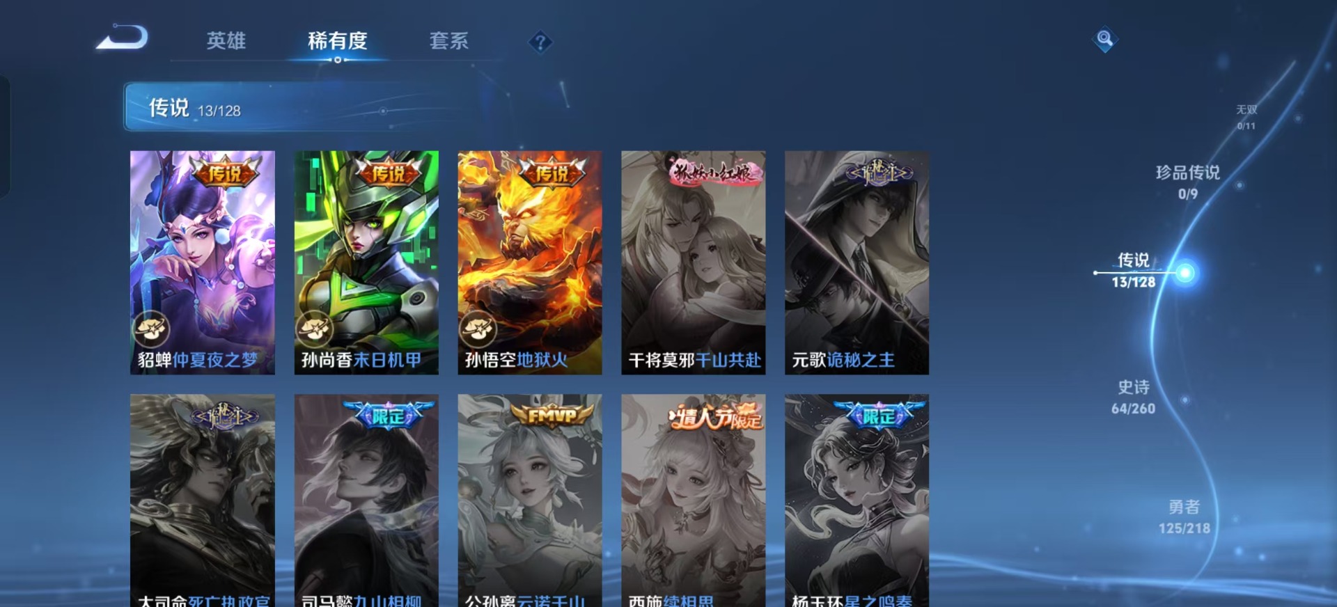 - [12003041]V7 2典藏 12传说 124英雄 237皮肤 可修改实名 优质装备:无限飓风号(高达),神鉴启示录,冠军飞将,久胜战神,云霓雀翎,无双飞将,澜逐花归海,诡秘之主,涂山容容 传说皮:典韦战鼓燎原 珍宝阁皮:蔷薇恋人,玩趣恶龙 限定皮:愿照·岁时盈(虞姬年限),愿照·山河定(司空震年限),陌上桑,鸣野蒿,至尊宝,时雨天司(水龙头),诗剑行,冰锋战神,天狼绘梦者,李小龙,如梦令-后羿,孙行者,寅虎·心曲(虎婆) 史诗皮:鸭鸭历险记-刘禅,器灵·浮梦炉,灵蛊蚀心,星界战将,谪仙醉月,龙之律动,石田雨龙,百相守梦-周瑜,茶境仙,破空之剑,百相守梦-百里守约,百相守梦-黄忠,紫霞仙子,特工魅影,千年之狐,偶像歌手,末日机甲-吕布,猫狗日记-孙策,乱世虎臣,节奏热浪,修罗,女仆咖啡,摇滚巨星,水果甜心,绅士熊喵,功夫厨神,德古拉伯爵,暗隐猎兽者,幽灵船长,鬼剑武藏,心灵战警,乐园奇幻夜,天秀·启明,舞动绿茵,地狱岩魂,缤纷独角兽,乘风破浪,逐浪之夏,水晶猎龙者,曙光守护者,箭羽风息,圣诞狂欢,圣诞恋歌,鹰眼统帅,暗夜贵公子,黎明之约,无心,未来纪元-赵云
