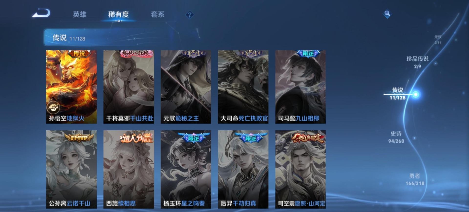 伽罗天狼溯光者,后羿辉光之辰,诸葛亮时雨天司,上官婉儿梁祝,马可波罗逐梦之星,桑启鸣野蒿,孙悟空大圣娶亲,孙悟空至尊宝,妲己愿照·众生和,虞姬愿照·岁时盈