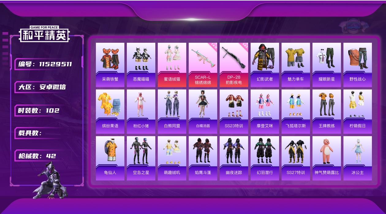 [11529511]1粉装 2特效枪 2印记 可二次 可修改实名 女号 安全保护中 优质装备:SCAR-L-锦绣绵绵 热门装扮:蜜语绒猫,恶魔喵喵,呆萌铁蟹 稀有枪皮:DP-28-豹影疾电 五级特效枪:五级SCAR-L-锦绣绵绵 一级特效枪:一级DP-28-豹影疾电 紫色装扮:飞狐塔尔斯,SS23特训,摩登艾咪,野性战心,缤纷果语,耀眼新星,魅力单车,龟仙人,柠萌假日,幻影武者,白熊同盟,空岛之星,王牌教练,SS28特训,神气赞萌露比,冰公主,都市丽猫,粉红小猪,焰鹰斗篷,幻羽潜行,幽夜迷踪,SS27特训,萌趣绒叽,SS32特训服(SS32特训套装),白糯汤圆 优质战备:精灵梦叶罗丽降落伞,江南烟雨降落伞,第五大道降落伞,飞行器-天之羽翼