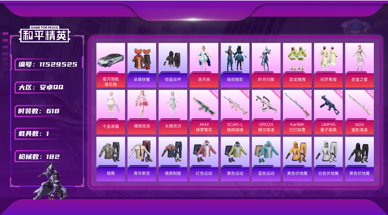 [11529525]8粉装 6特效枪 1载具 6印记 可二次 可修改实名 优质装备:星河领航(磐石银),洛天依,M24莲影清波,AKM绿萝繁花,SCAR-L-锦绣绵绵,UMP45量子极限,千金淑猫,GROZA-镜光银凌,女娲灵识,樱桃泡泡,Kar98K-巳巳如意 热门装扮:吟月归客,恐龙拽拽,闲梦青缨,圣堂之誓,恒星战甲,呆萌铁蟹,暗夜魅影 五级特效枪:五级UMP45-量子极限,五级GROZA-镜光银凌,五级Kar98K-巳巳如意,五级SCAR-L-锦绣绵绵,五级AKM-绿萝繁花 三级特效枪:三级M24-莲影清波 紫色装扮:田园牧歌,轻风白浪,SS22特训,莱茵河畔,SS23特训,娇憨猪猪,萌趣咩咩,SS21特训,SS31特训套装,SS2特训,SS5特训,冰川特警,北国孤狼,千禧之恋,午夜朋克,SS30特训套装,SS33特训套装,青涩时光,潮流游乐家,SS15特训,闪银刀客,冰爽风暴,星河入梦,击剑大师,诡谋托雷基亚,治愈之星,迅捷之星,科技之星,SS14特训,萌趣颜团子,特种颜团子,SS19特训,竞技角斗士,吉莉礼服,瑞龙福将,团圆交子,SS17特训,极乐追光,SS18特训,都市漫游者,都市魅力,金鼠迎春,长空猛禽,雪山精英,霓虹街区,青年教官,青春校园,风暴特警,缤纷果语,耀眼新星,蓝彩潮人,蓝色运动,虎虎生威吉莉,跃动心情,魅力单车,鹤鸣,黄色伏地魔,黄色名流,黄色运动,黎明保卫者,黑色伏地魔,龙的传人,龟仙人,龙魂突击队,蝶变,香桃花海,和平特警,极地朋克,柠萌假日,格斗先锋,橘黑制服,沙漠兵团,派对绅士,清新柠檬,滨海假日,幻影武者,坚韧舞者,夏日音浪,夜莺强袭者,完美偶像,帅气教官,恋恋初桃,战地菁英,滨海厨神,绮丽涂鸦,甜蜜菠萝,疯狂小兔子,白色伏地魔,破晓战魂,破蛋小黄鸡,甜蜜告白,福星高照,空岛之星,竞技勇士朋克,竞技达人朋克,红色运动,甜蜜熊情侣,牛气冲天,灰色格斗者,灼焰舞者,炫蓝之夏,牛气满满,猛禽,特战装甲,特殊使命,特训学院,猎鹰,雏菊兔兔,萝兰蝴蝶,SS29特训,狂花道·娜可露露,湖畔霞光,星途旅人,SS28特训,铁血战翼,玉兔迎春,巳巳如意,都市丽猫,青团波波,糖糖葫芦,竞技名士,绒宝小鹅,街头风暴,惊鸿侠骨,SS25特训,锦衣飞扬,SS27特训,明鸳圣池,云霞荷露,晨曦薄雾,SS26特训,春光漫游,快闪甜心,贝斯之夜,SS6特训,SS7特训,黑夜传