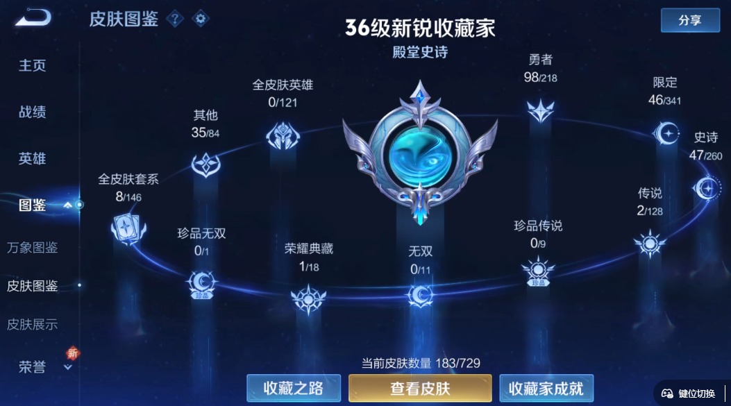 - PX_2109991-Q/至尊星耀/238皮肤/125英雄/1典藏/0珍品无双/1无双/3珍品传说/14传说/77史诗/9稀有英雄 【3 珍品传说】酷洛米之心 安琪拉,大耳狗之梦 瑶,怪盗基德 马可波罗, 【1 典藏皮肤】拾光映像 瑶, 【1 无双皮肤】时之魔女 小乔, 【14 传说皮肤】鹤归松栖 云缨,永恒水手月亮 王昭君,启明星使 虞姬,逐花归海 澜,游龙清影 西施,仲夏夜之梦 貂蝉,乞巧织情