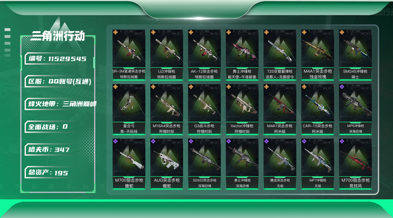 [11529545]总资产:195.1M 1干员外观 13传说枪械 哈夫币:347.539K 高级安全箱(9.17到期) 可二次 可修改实名 烽火地带段位:三角洲巅峰 全面战场段位:列兵 传说武器皮肤:SMG45冲锋枪-骑士,UZI冲锋枪-特斯拉线圈,M16A4突击步枪-狩猎时刻,AK-12突击步枪-特斯拉线圈,SR-3M紧凑突击步枪-特斯拉线圈,勇士冲锋枪-能天使-午夜邮差,Vector冲锋枪-狩猎时刻,G3战斗步枪-狩猎时刻,复合弓-黑-天际线,725双管霰弹枪-送葬人-无题密令,M4A1突击步枪-阿米娅,CAR-15突击步枪-阿米娅,M4A1突击步枪-蚀金玫瑰 史诗武器皮肤:PSG-1射手步枪-原型机(典藏),AUG突击步枪-蝮蛇,M700狙击步枪-蝮蛇,PKM通用机枪-蝮蛇,M16A4突击步枪-竞赛选手,M1014霰弹枪-林中猎手,MP5冲锋枪-深海恐惧,勇士冲锋枪-深海恐惧,SG552突击步枪-深海恐惧,AKM突击步枪-林中猎手,SVD狙击步枪-暗夜猎手,SV-98狙击步枪-林中猎手,PTR-32突击步枪-英雄,AS Val突击步枪-典狱官,PKM通用机枪-荒野求生,腾龙突击步枪-无垢,MP7冲锋枪-无垢,SVD狙击步枪-荒野求生,SR-3M紧凑突击步枪-荒野求生,沙漠之鹰-曙光,Vector冲锋枪-阿萨拉文明,M700狙击步枪-竞技风 干员外观:红狼-蚀金玫瑰