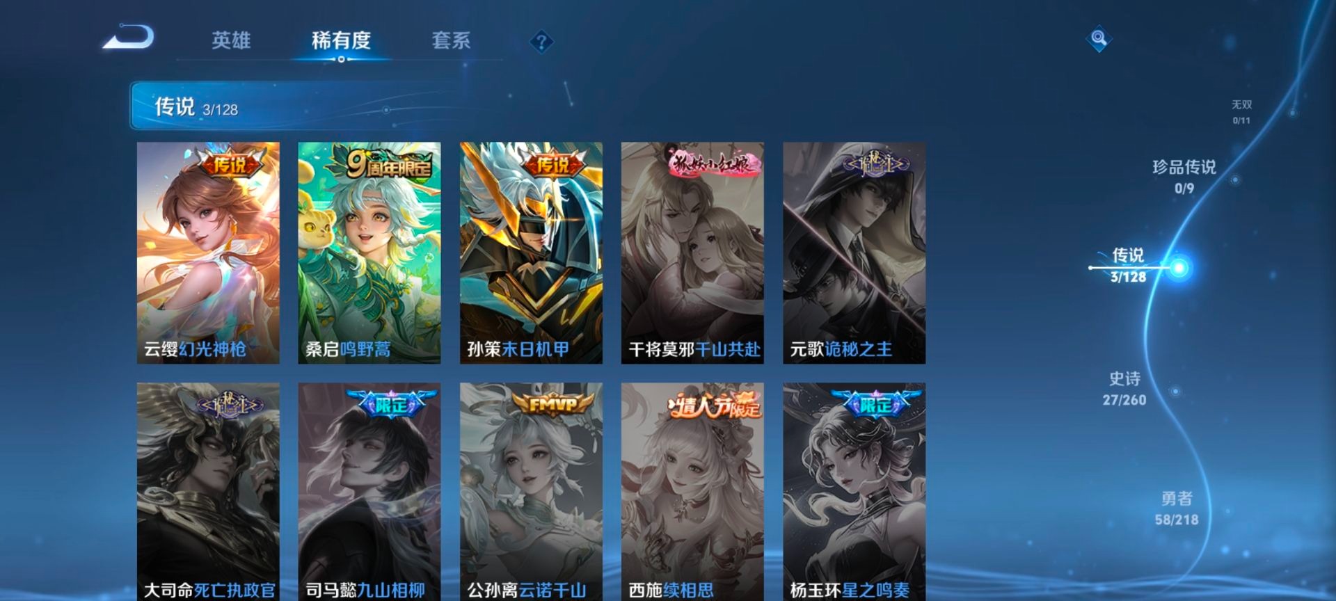 - [11574409]V7 4传说 124英雄 157皮肤 可修改实名 优质装备:冠军飞将,地狱火,时之恋人-刘备(电焊工),超时空战士-狄仁杰 珍宝阁皮:蔷薇恋人 限定皮:神威(电光马子),遇见飞天,梁祝,李小龙 史诗皮:苍鳞隐世,百相守梦-黄忠,白龙吟,特工魅影,江河有灵,乱世虎臣,节奏热浪,修罗,女仆咖啡,摇滚巨星,水果甜心,绅士熊喵,天才门将,心灵骇客,心灵战警,金属风暴,鹰眼统帅,无心
