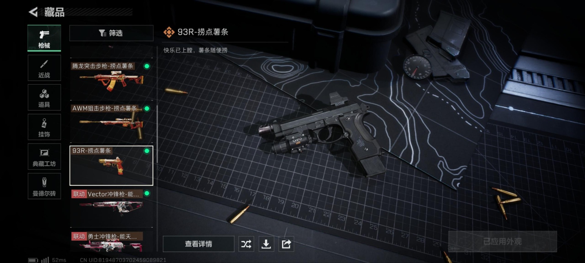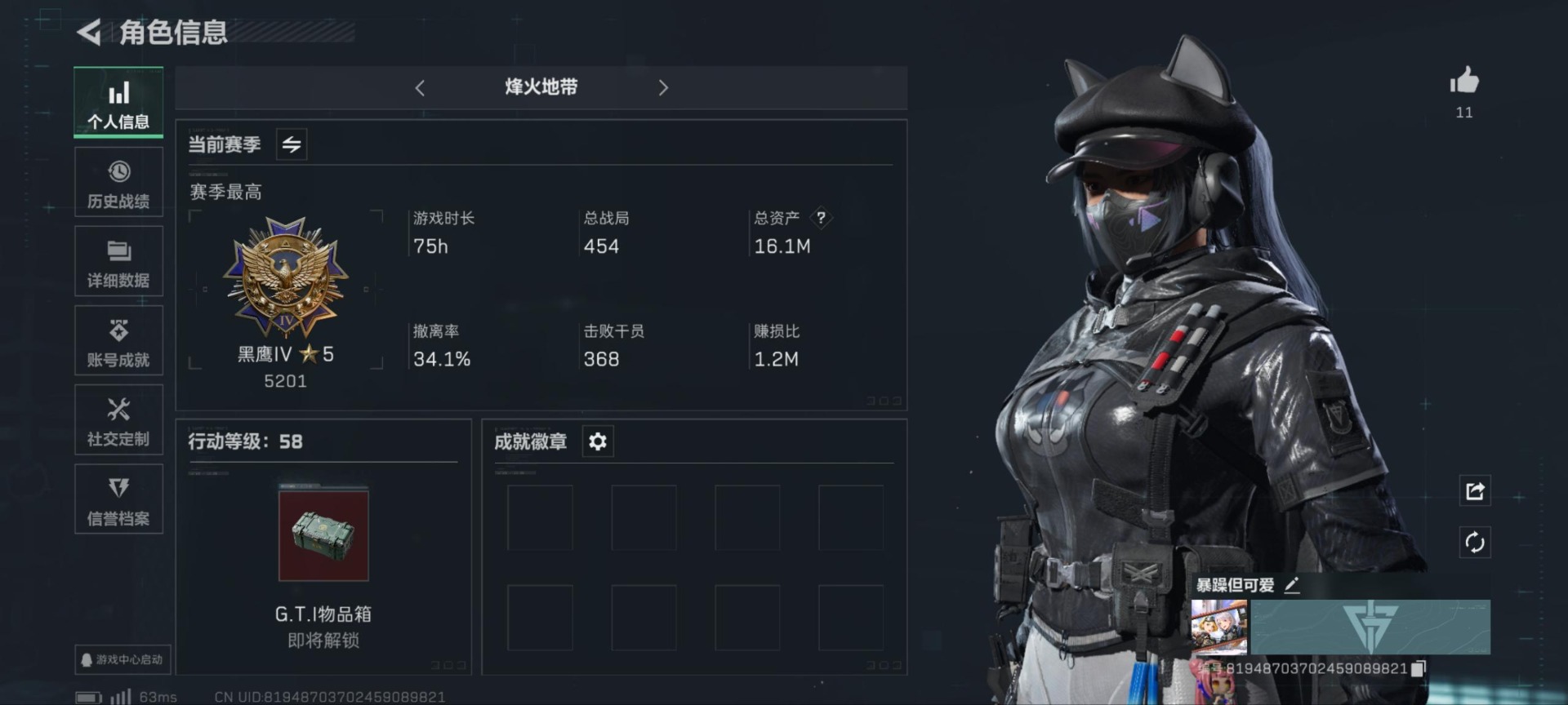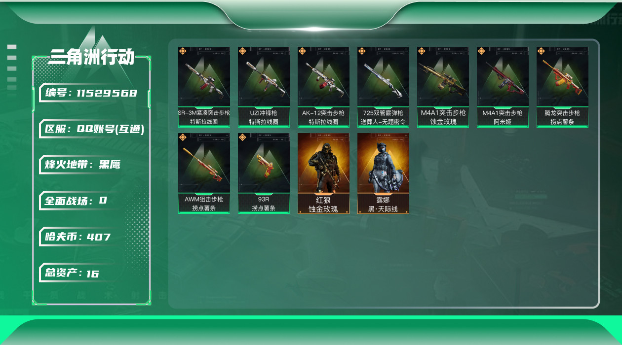 [11529568]总资产:16.1M 2干员外观 9传说枪械 哈夫币:407.760K 高级安全箱(9.17到期) 可二次 可修改实名 烽火地带段位:黑鹰 全面战场段位:列兵 传说武器皮肤:93R-捞点薯条,AWM狙击步枪-捞点薯条,腾龙突击步枪-捞点薯条,AK-12突击步枪-特斯拉线圈,SR-3M紧凑突击步枪-特斯拉线圈,UZI冲锋枪-特斯拉线圈,M4A1突击步枪-阿米娅,725双管霰弹枪-送葬人-无题密令,M4A1突击步枪-蚀金玫瑰 干员外观:红狼-蚀金玫瑰,露娜-黑·天际线