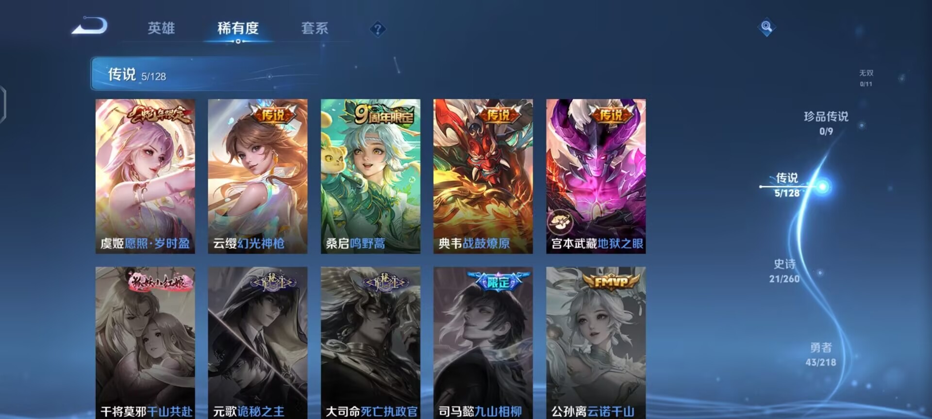 大乔猫狗日记,貂蝉圣诞恋歌,安琪拉心灵骇客,曹操幽灵船长,伽罗箭羽风息,亚瑟心灵战警,伽罗琥珀纪元,雅典娜冰冠公主,诸葛亮黄金分割率