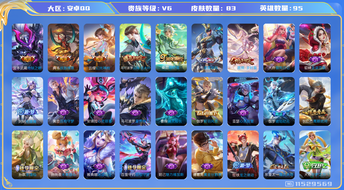 [11529569]V6 5传说 95英雄 83皮肤 可修改实名 优质装备:地狱之眼 传说皮:典韦战鼓燎原,幻光神枪 限定皮:愿照·岁时盈(虞姬年限),逐霄战戟,鸣野蒿,山海·玄木吟(马可年限) 史诗皮:化蝶舞,龙之律动,茶境仙,琥珀纪元伽罗,百相守梦-百里守约,星界特工,百相守梦-黄忠,黄金分割率,冰冠公主,猫狗日记-大乔,水果甜心,心灵骇客,幽灵船长,心灵战警,箭羽风息,圣诞恋歌,鹰眼统帅,魅力维加斯