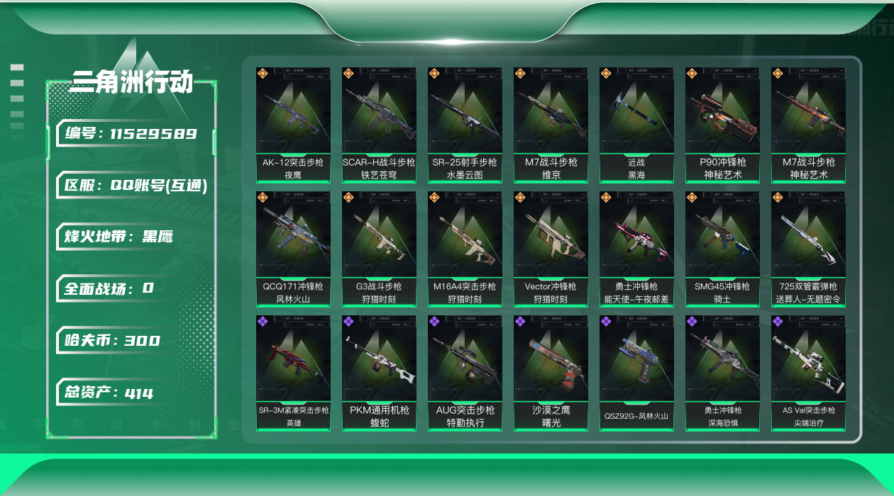 [11529589]总资产:414M 3干员外观 1近战传说 14传说枪械 哈夫币:300K 可二次 可修改实名 优质装备:近战-黑海,顶级安全箱(3x3) 烽火地带段位:黑鹰 全面战场段位:军士长 传说武器皮肤:QCQ171冲锋枪-风林火山,SR-25射手步枪-水墨云图,SCAR-H战斗步枪-铁艺苍穹,AK-12突击步枪-夜鹰,SMG45冲锋枪-骑士,Vector冲锋枪-狩猎时刻,G3战斗步枪-狩猎时刻,M16A4突击步枪-狩猎时刻,勇士冲锋枪-能天使-午夜邮差,725双管霰弹枪-送葬人-无题密令,P90冲锋枪-神秘艺术,M7战斗步枪-神秘艺术,M7战斗步枪-维京 史诗武器皮肤:SR-3M紧凑突击步枪-英雄,QBZ95-1突击步枪-ACE,M4A1突击步枪-特勤执行,AUG突击步枪-特勤执行,Vector冲锋枪-红色彗星,PTR-32战斗步枪-ACE,AUG突击步枪-蝮蛇,M700狙击步枪-蝮蛇,PKM通用机枪-蝮蛇,G3战斗步枪-战场英杰,Ash-12战斗步枪-守夜人,SVD狙击步枪-暗夜猎手,M16A4突击步枪-竞赛选手,PKM通用机枪-守夜人,AS Val突击步枪-尖端治疗,SG552突击步枪-尖端治疗,SR-25射手步枪-尖端治疗,MP5冲锋枪-深海恐惧,勇士冲锋枪-深海恐惧,AKM突击步枪-林中猎手,SR-3M紧凑突击步枪-荒野求生,M1014霰弹枪-林中猎手,SV-98狙击步枪-林中猎手,PTR-32突击步枪-英雄,AS Val突击步枪-典狱官,SCAR-H战斗步枪-囚徒,PSG-1射手步枪-无垢,M14射手步枪-黑鹰坠落,UZI冲锋枪-危险实验,M249轻机枪-维京,SCAR-H战斗步枪-危险实验,沙漠之鹰-曙光,Vector冲锋枪-阿萨拉文明,S12K霰弹枪-曙光,PKM通用机枪-英雄,QSZ92G-风林火山,93R-博士 干员外观:无名-夜鹰,蜂医-送葬人·无题密令(S5),露娜-黑·天际线