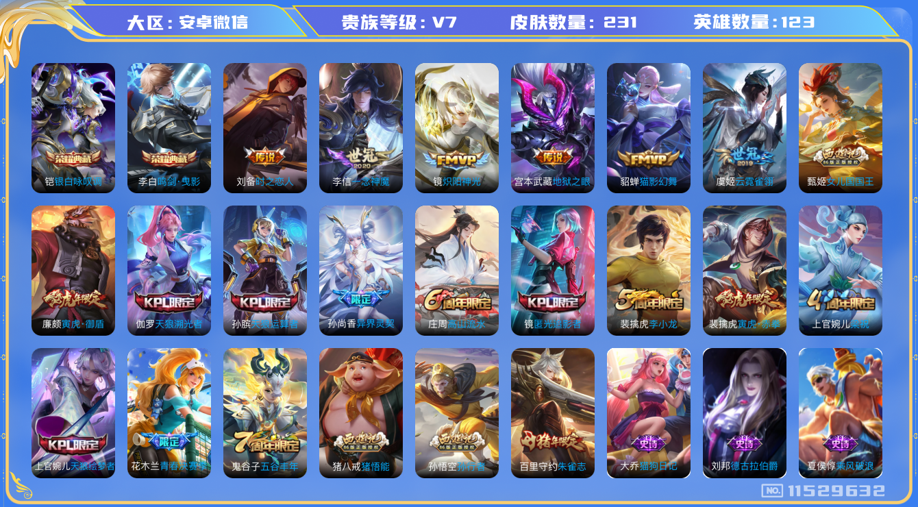 [11529632]V7 2典藏 8传说 123英雄 231皮肤 可修改实名 优质装备:鸣剑·曳影,银白咏叹调(倪克斯侍卫),猫影幻舞,炽阳神光,一念神魔,云霓雀翎,地狱之眼,时之恋人-刘备(电焊工) 珍宝阁皮:优雅恋人,蔷薇恋人 限定皮:异界灵契(白毛香),高山流水,五谷丰年,天狼运算者,梁祝,天狼溯光者,天狼绘梦者,李小龙,朱雀志(守约年限),孙行者,猪悟能,青春决赛季,匿光追影者,女儿国国王,寅虎·御盾(廉颇年限),寅虎·赤拳(老虎年限) 史诗皮:紫霞仙子,苍穹之光,电玩小子(小书包),特工魅影,魅语,冰冠公主,偶像歌手,晚萤,暗夜猫娘,龙骑士(小龙虾),末日机甲-吕布,猫狗日记-孙策,猫狗日记-大乔,乱世虎臣,节奏热浪,修罗,女仆咖啡,摇滚巨星,水果甜心,绅士熊喵,天才门将,星夜王子,心灵骇客,时之奇旅-安琪拉,功夫厨神,德古拉伯爵,暗隐猎兽者,幽灵船长,鬼剑武藏,心灵战警,舞动绿茵,地狱岩魂,繁星吟游(呼啦呼啦),缤纷独角兽,乘风破浪,逐浪之夏,龙鼓争鸣,水晶猎龙者,曙光守护者,箭羽风息,金属风暴,原初追逐者,圣诞狂欢,圣诞恋歌,鹰眼统帅,暗夜贵公子,魅力维加斯,黎明之约,寅虎·御盾,未来纪元-赵云