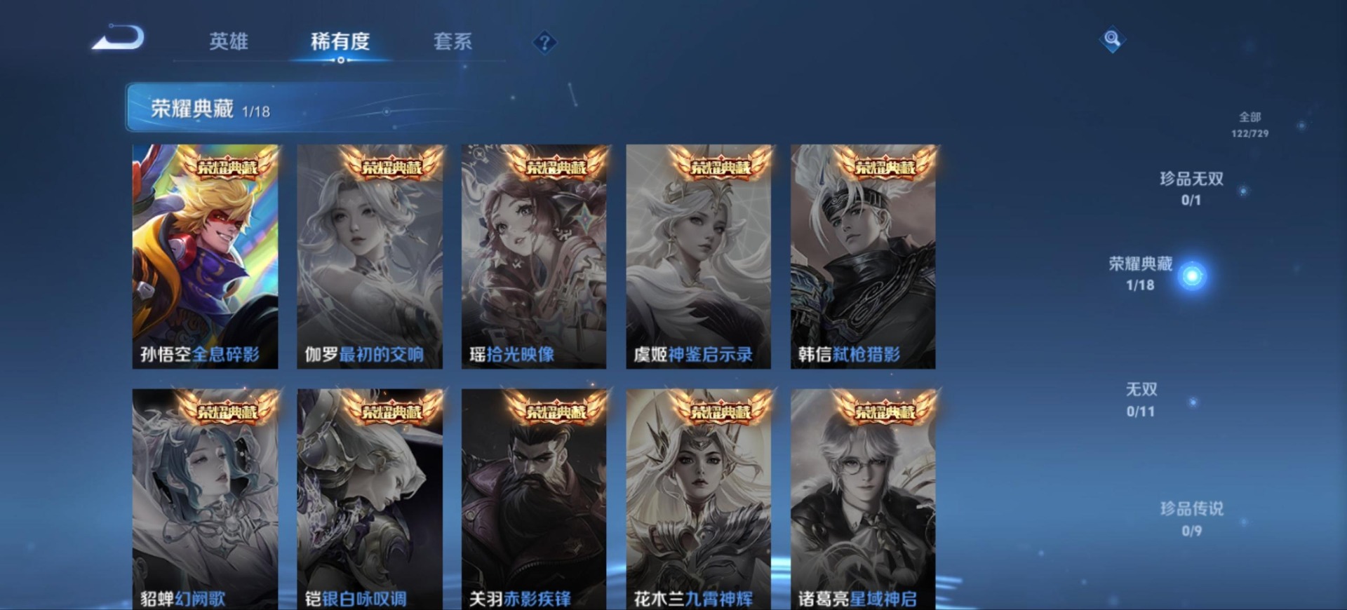 - PX_2081919-贵族等级: V6 英雄数: 122 皮肤数: 190 传说皮: 淬星耀世,灼幽烈阳,琥珀纪元铠 限定皮: 遇见飞天,李小龙,奔雷神使,梁祝,高山流水,猪悟能,五谷丰年