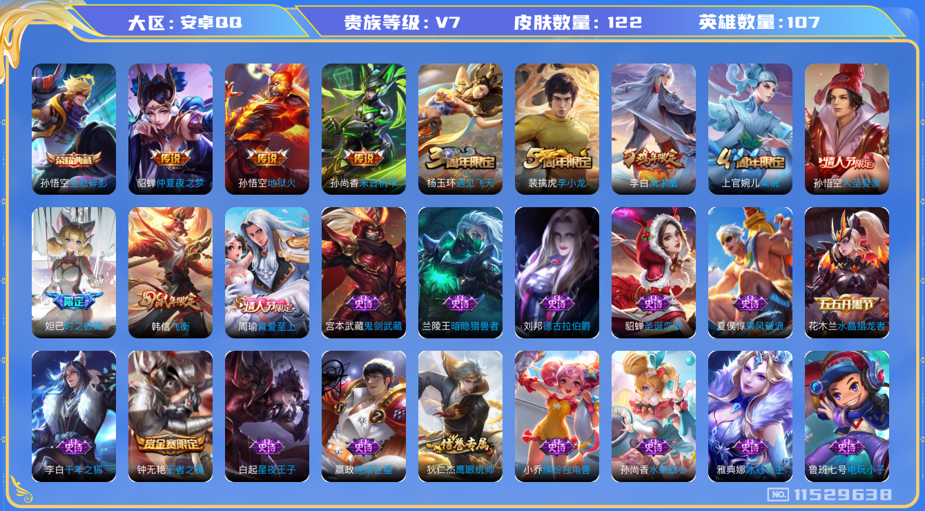 [11529638]V7 1典藏 4传说 107英雄 122皮肤 可修改实名 优质装备:全息碎影(猴子典藏),末日机甲-孙尚香(绿蚂蚱),地狱火,仲夏夜之梦(大飞蛾) 限定皮:凤求凰(白切鸡),时之彼端,飞衡(韩信年限),遇见飞天,梁祝,李小龙,真爱至上,大圣娶亲 史诗皮:紫霞仙子,电玩小子(小书包),黄金分割率,特工魅影,千年之狐,冰冠公主,摇滚巨星,水果甜心,星夜王子,德古拉伯爵,暗隐猎兽者,鬼剑武藏,舞动绿茵,缤纷独角兽,乘风破浪,逐浪之夏,水晶猎龙者,圣诞恋歌,鹰眼统帅,王者之锤,魅力维加斯