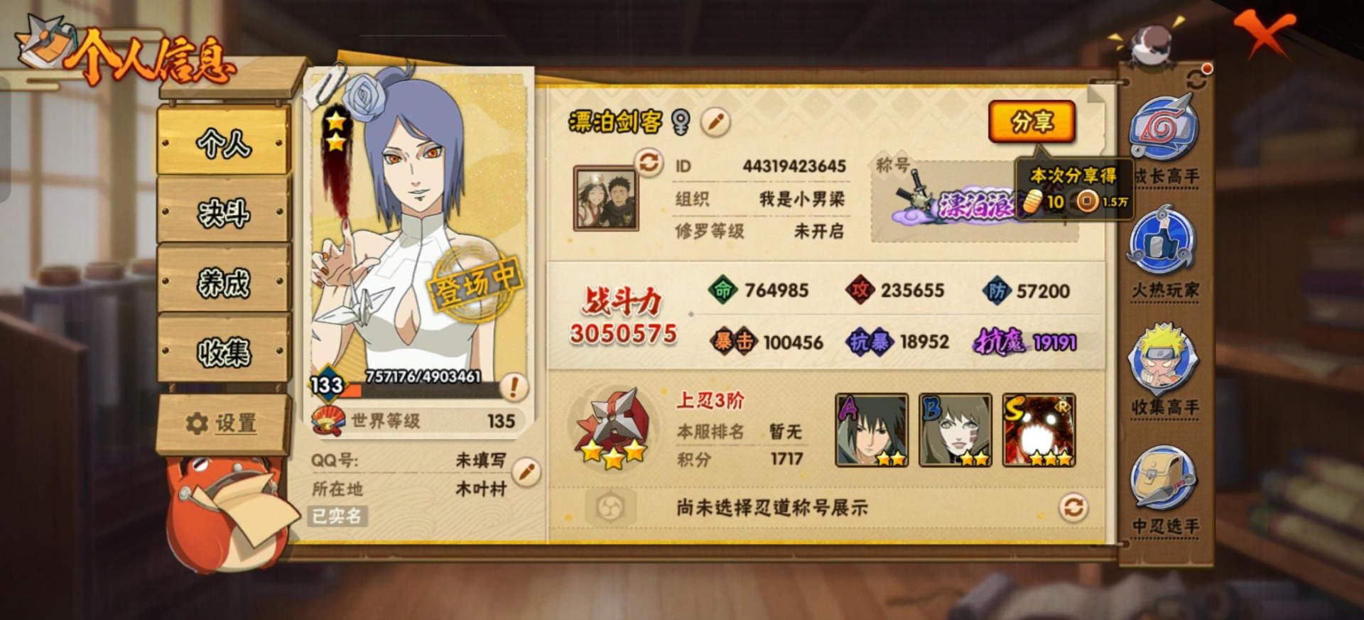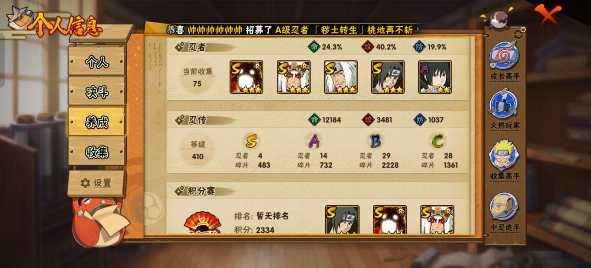 [11529669]V9 4S忍 14A忍 10通灵 305W战力 可二次 可修改实名 优质装备:漩涡鸣人 「暴怒·第六尾」 S级忍者:自来也 「舞之豪杰」,宇智波鼬 「须佐能乎」,自来也