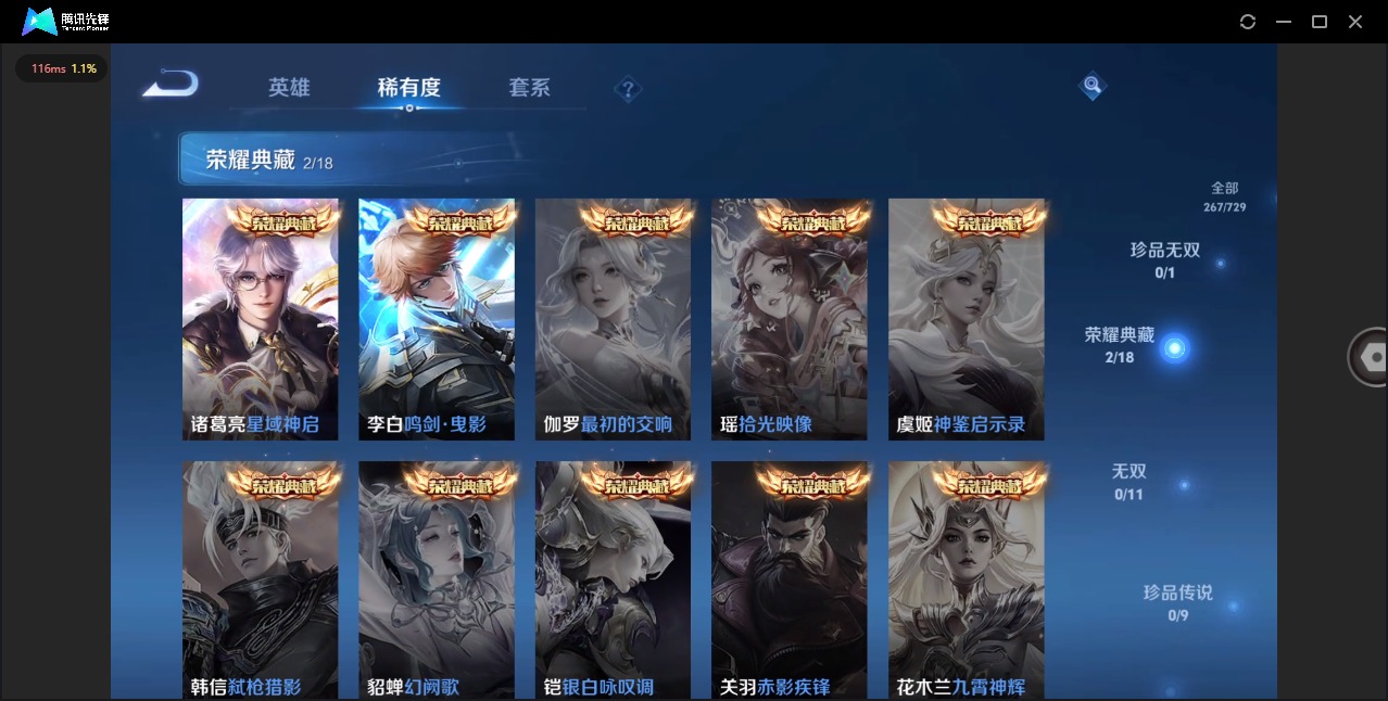 - [11883611]V7 12传说 125英雄 219皮肤 可修改实名 优质装备:云鹰飞将(小将军),炽阳神光,一念神魔,末日机甲-孙尚香(绿蚂蚱),超时空战士-狄仁杰,无双飞将,燃星之曲,记忆之芯(机甲兔),妄想实况,澜逐花归海 传说皮:祥瑞亨通 珍宝阁皮:胡桃夹子,蔷薇恋人 限定皮:逐霄战戟,至尊宝,异界灵契(白毛香),飞衡(韩信年限),遇见飞天,五谷丰年,冰锋战神,李小龙,大圣娶亲 史诗皮:化蝶舞,星界战将,谪仙醉月,石田雨龙,琥珀纪元伽罗,百相守梦-百里守约,星界特工,百相守梦-黄忠,黄金分割率,特工魅影,千年之狐,蒙恬荣光圣徽,偶像歌手,猫狗日记-孙策,乱世虎臣,节奏热浪,修罗,摇滚巨星,水果甜心,德古拉伯爵,暗隐猎兽者,鬼剑武藏,天秀·启明,纤云弄巧,乘风破浪,月团寄思,水晶猎龙者,唤灵魅影,金属风暴,原初追逐者,圣诞狂欢,鹰眼统帅,魅力维加斯,黎明之约,赏金猎手,无心,未来纪元-赵云
